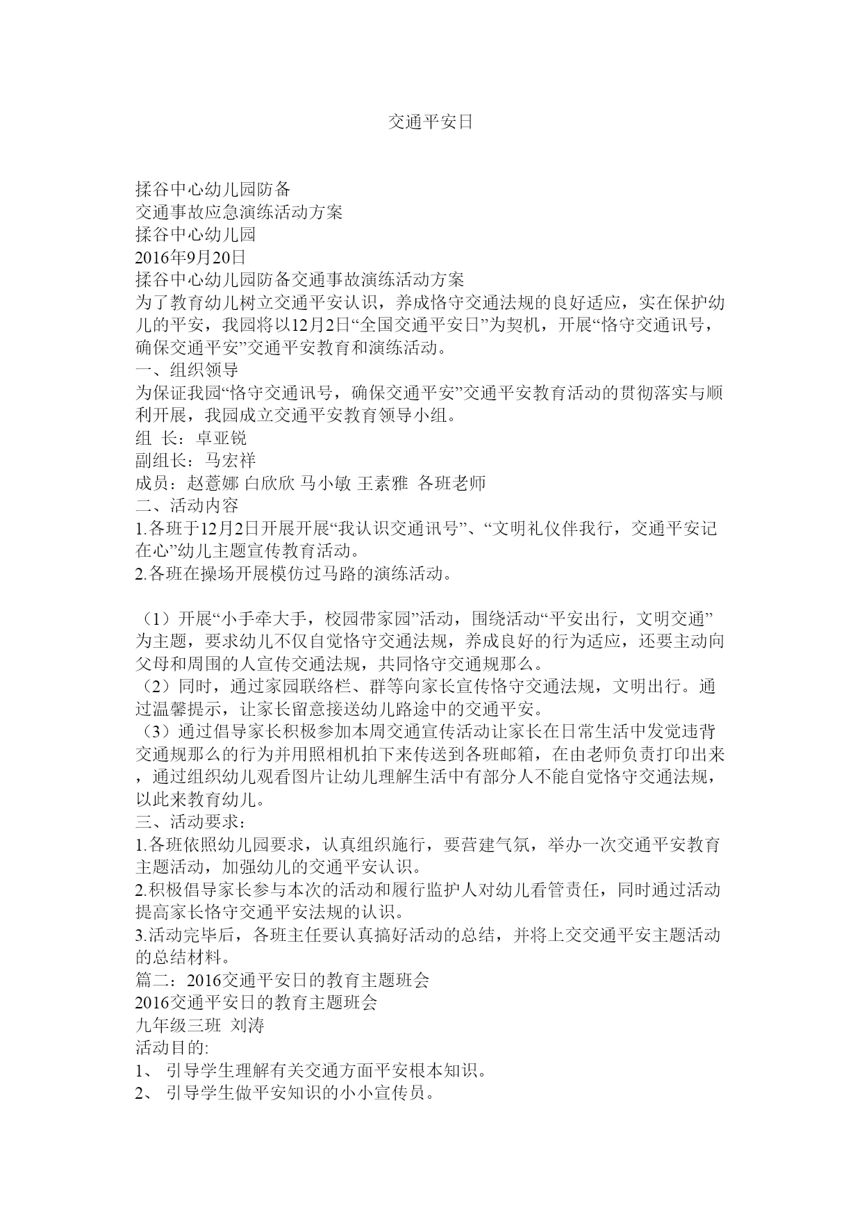 交通平安日揉谷中心幼儿园防备交通事故应急演练活动方案揉谷中心幼儿园2016年9月20日揉谷中心幼儿园防备交通事故演练活动方案为了教育幼儿树立交通平安认识,养成恪守交通法规的良好适应,实在保护幼儿的平安,我园将以12月2日“全国交通平安日”为契机,开展“恪守交通讯号,确保交通平安”交通平安教育和演练活动。一、组织领导为保证我园“恪守交通讯号,确保交通平安”交通平安教育活动的贯彻落实与顺利开展,我园成立交通平安教育领导小组。组长:卓亚锐副组长:马宏祥成员:赵薏娜白欣欣马小敏王素雅各班老师二、活动内容1.各班于