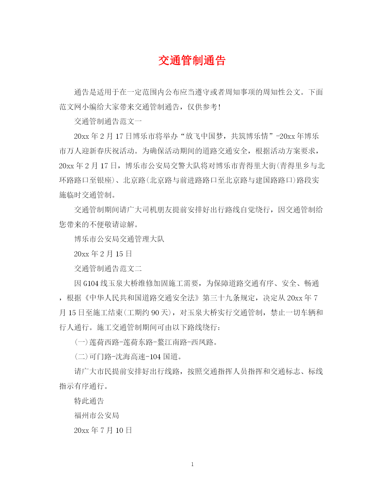 此资料由网络收集而来,如有侵权请告知上传者立即删除。资料共分享,我们负责传递知识。PAGEPAGE2交通管制通告通告是适用于在一定范围内公布应当遵守或者周知事项的周知性公文。下面范文网小编给大家带来交通管制通告,仅供参考!交通管制通告范文一20xx年2月17日博乐市将举办“放飞中国梦,共筑博乐情”-20xx年博乐市万人迎新春庆祝活动。为确保活动期间的道路交通安全,根据活动方案要求,20xx年2月17日,博乐市公安局交警大队将对博乐市青得里大街(青得里乡与北环路路口至银座)、北京路(北京路与前进