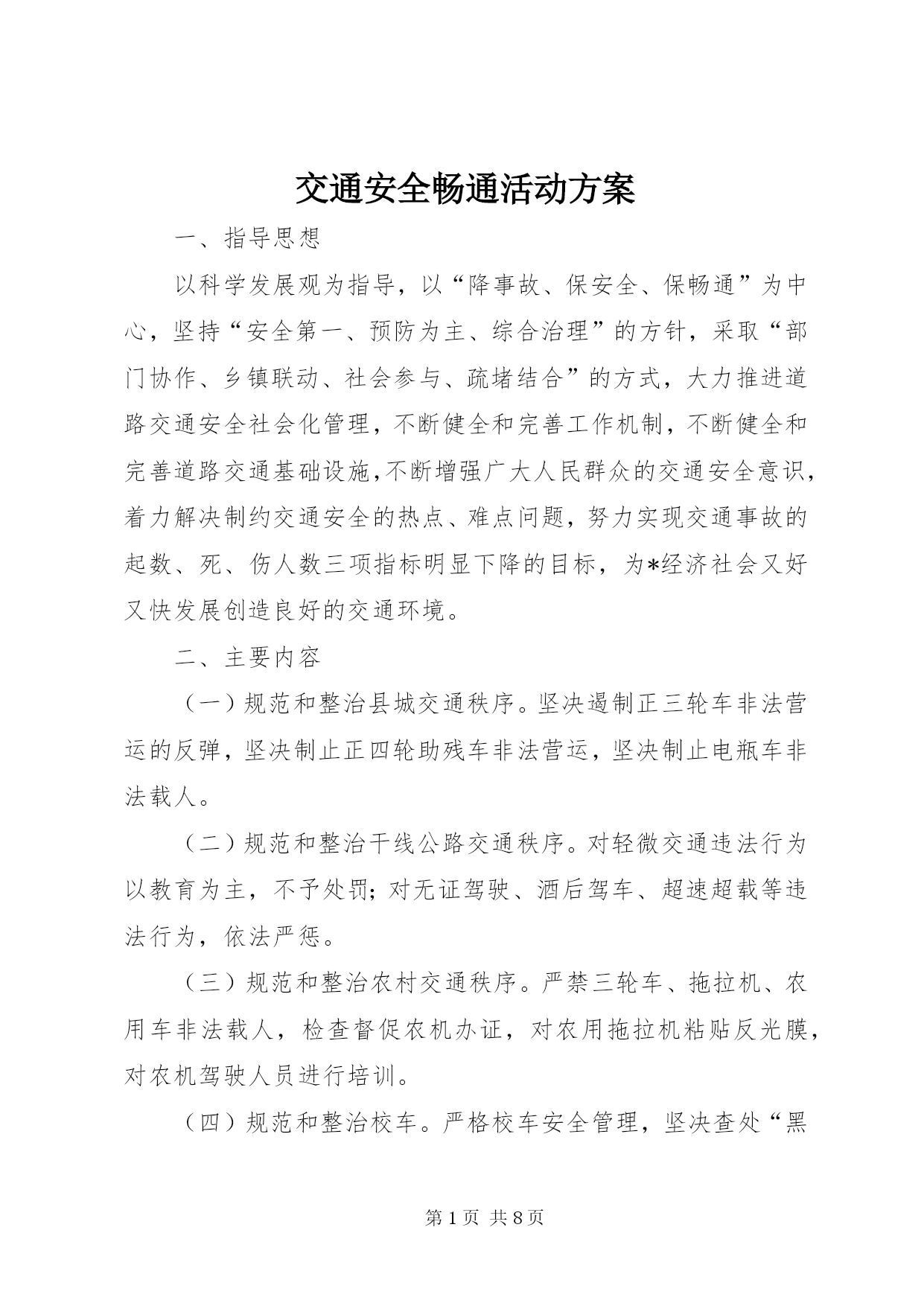 第PAGE\*Arabic\*MERGEFORMAT8页共NUMPAGES\*MERGEFORMAT8页交通安全畅通活动方案一、指导思想以科学发展观为指导,以“降事故、保安全、保畅通”为中心,坚持“安全第一、预防为主、综合治理”的方针,采取“部门协作、乡镇联动、社会参与、疏堵结合”的方式,大力推进道路交通安全社会化管理,不断健全和完善工作机制,不断健全和完善道路交通基础设施,不断增强广大人民群众的交通安全意识,着力解决制约交通安全的热点、难点问题,努力实现交通事故的起数、死、伤人数三项指标明显