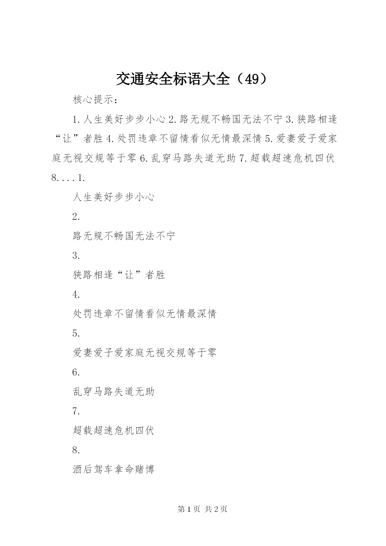 第PAGE\*Arabic\*MERGEFORMAT2页共NUMPAGES\*MERGEFORMAT2页交通安全标语大全(49)核心提示:1.人生美好步步小心2.路无规不畅国无法不宁3.狭路相逢“让”者胜4.处罚违章不留情看似无情最深情5.爱妻爱子爱家庭无视交规等于零6.乱穿马路失道无助7.超载超速危机四伏8....1.人生美好步步小心2.路无规不畅国无法不宁3.狭路相逢“让”者胜4.处罚违章不留情看似无情最深情5.爱妻爱子爱家庭无视交规等于零6.乱穿马路失道无助7.超载超速危机四伏8.酒后驾