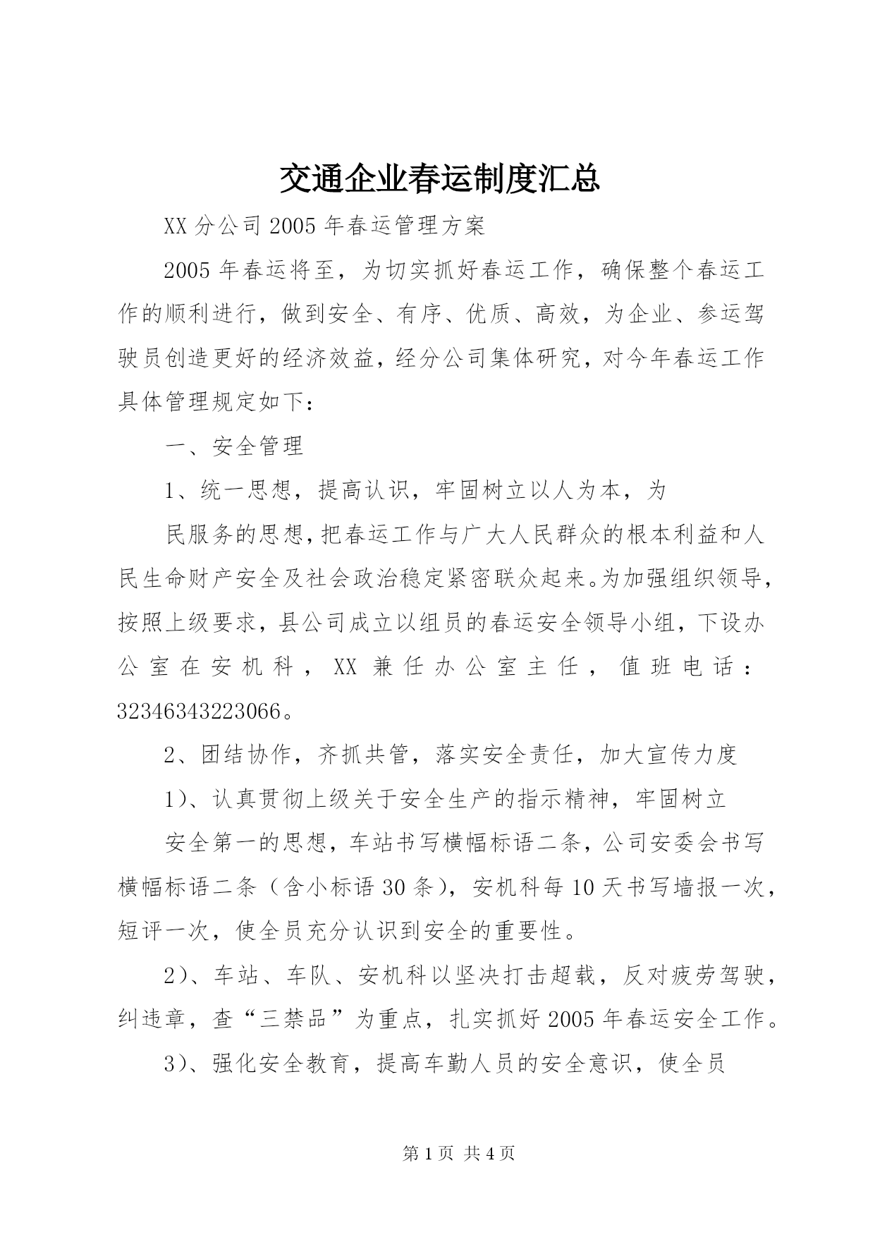 第PAGE\*Arabic\*MERGEFORMAT4页共NUMPAGES\*MERGEFORMAT4页交通企业春运制度汇总XX分公司2005年春运管理方案2005年春运将至,为切实抓好春运工作,确保整个春运工作的顺利进行,做到安全、有序、优质、高效,为企业、参运驾驶员创造更好的经济效益,经分公司集体研究,对今年春运工作具体管理规定如下:一、安全管理1、统一思想,提高认识,牢固树立以人为本,为民服务的思想,把春运工作与广大人民群众的根本利益和人民生命财产安全及社会政治稳定紧密联众起来。为加强组
