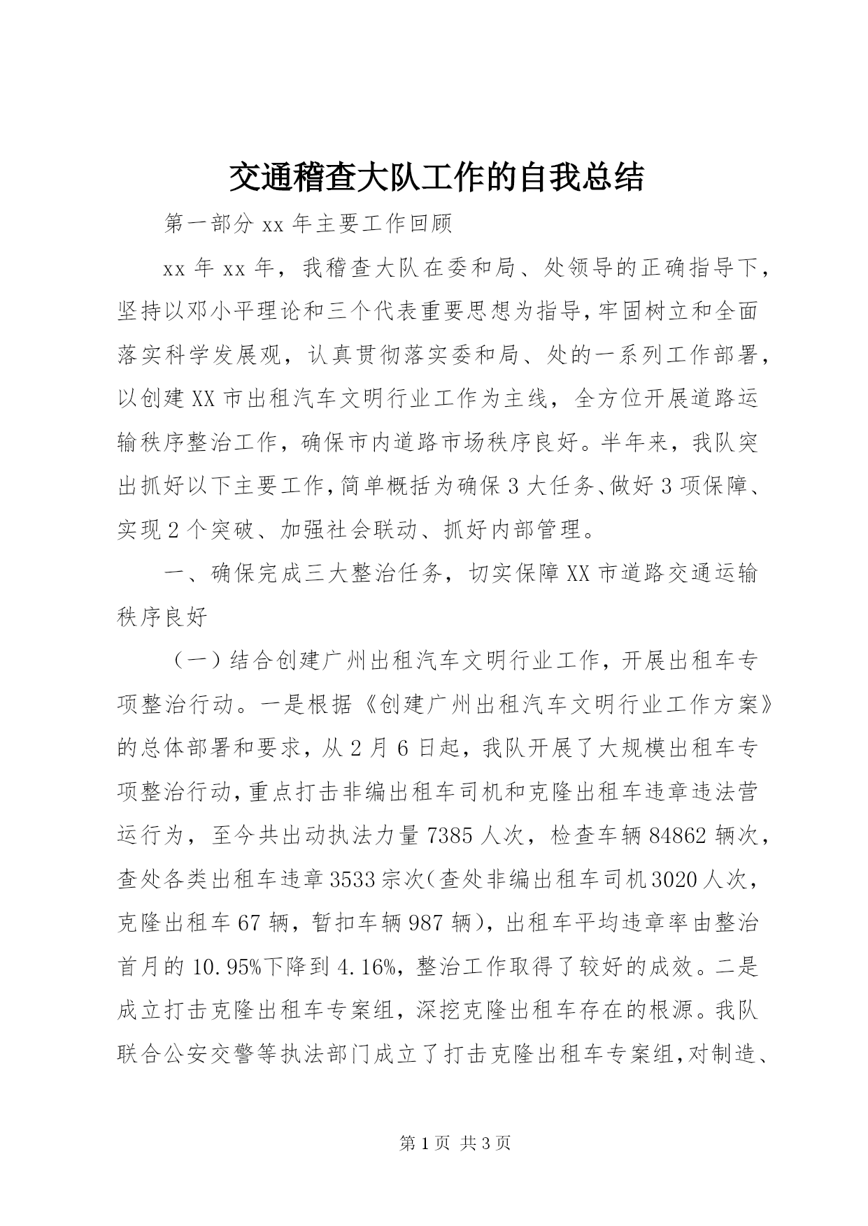 第PAGE\*Arabic\*MERGEFORMAT3页共NUMPAGES\*MERGEFORMAT3页交通稽查大队工作的自我总结第一部分xx年主要工作回顾xx年xx年,我稽查大队在委和局、处领导的正确指导下,坚持以邓小平理论和三个代表重要思想为指导,牢固树立和全面落实科学发展观,认真贯彻落实委和局、处的一系列工作部署,以创建XX市出租汽车文明行业工作为主线,全方位开展道路运输秩序整治工作,确保市内道路市场秩序良好。半年来,我队突出抓好以下主要工作,简单概括为确保3大任务、做好3项保障、实现2