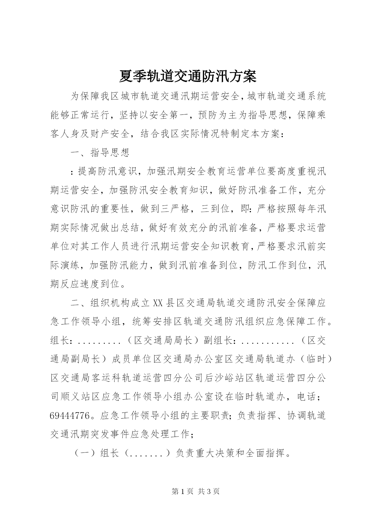 第PAGE\*Arabic\*MERGEFORMAT3页共NUMPAGES\*MERGEFORMAT3页夏季轨道交通防汛方案为保障我区城市轨道交通汛期运营安全,城市轨道交通系统能够正常运行,坚持以安全第一,预防为主为指导思想,保障乘客人身及财产安全,结合我区实际情况特制定本方案:一、指导思想:提高防汛意识,加强汛期安全教育运营单位要高度重视汛期运营安全,加强防汛安全教育知识,做好防汛准备工作,充分意识防汛的重要性,做到三严格,三到位,即:严格按照每年汛期实际情况做出总结,做好有效充分的汛前准备