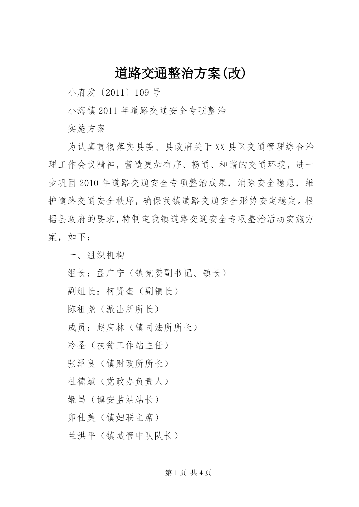 第PAGE\*Arabic\*MERGEFORMAT4页共NUMPAGES\*MERGEFORMAT4页道路交通整治方案(改)小府发〔2011〕109号小海镇2011年道路交通安全专项整治实施方案为认真贯彻落实县委、县政府关于XX县区交通管理综合治理工作会议精神,营造更加有序、畅通、和谐的交通环境,进一步巩固2010年道路交通安全专项整治成果,消除安全隐患,维护道路交通安全秩序,确保我镇道路交通安全形势安定稳定。根据县政府的要求,特制定我镇道路交通安全专项整治活动实施方案,如下:一、组织机构组