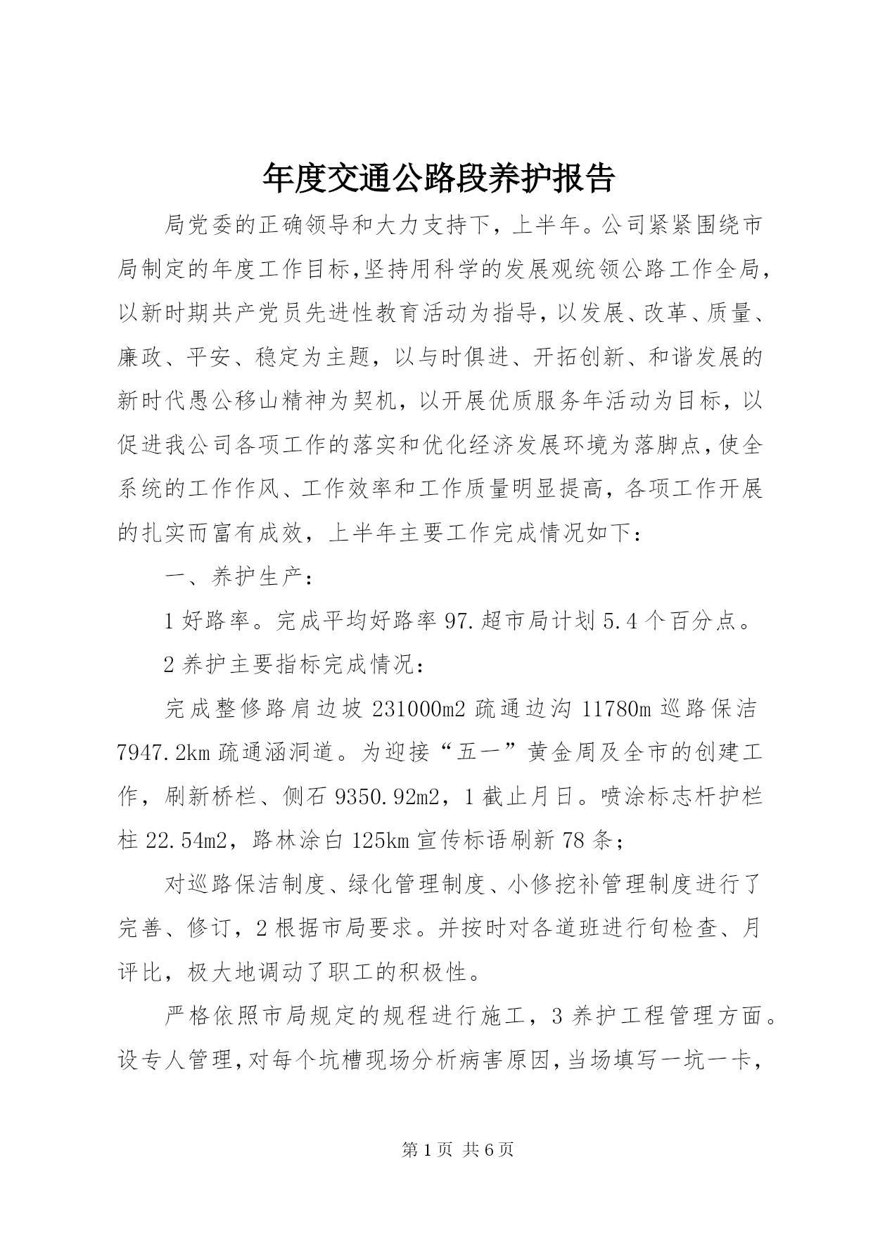 第PAGE\*Arabic\*MERGEFORMAT6页共NUMPAGES\*MERGEFORMAT6页年度交通公路段养护报告局党委的正确领导和大力支持下,上半年。公司紧紧围绕市局制定的年度工作目标,坚持用科学的发展观统领公路工作全局,以新时期共产党员先进性教育活动为指导,以发展、改革、质量、廉政、平安、稳定为主题,以与时俱进、开拓创新、和谐发展的新时代愚公移山精神为契机,以开展优质服务年活动为目标,以促进我公司各项工作的落实和优化经济发展环境为落脚点,使全系统的工作作风、工作效率和工作质量明