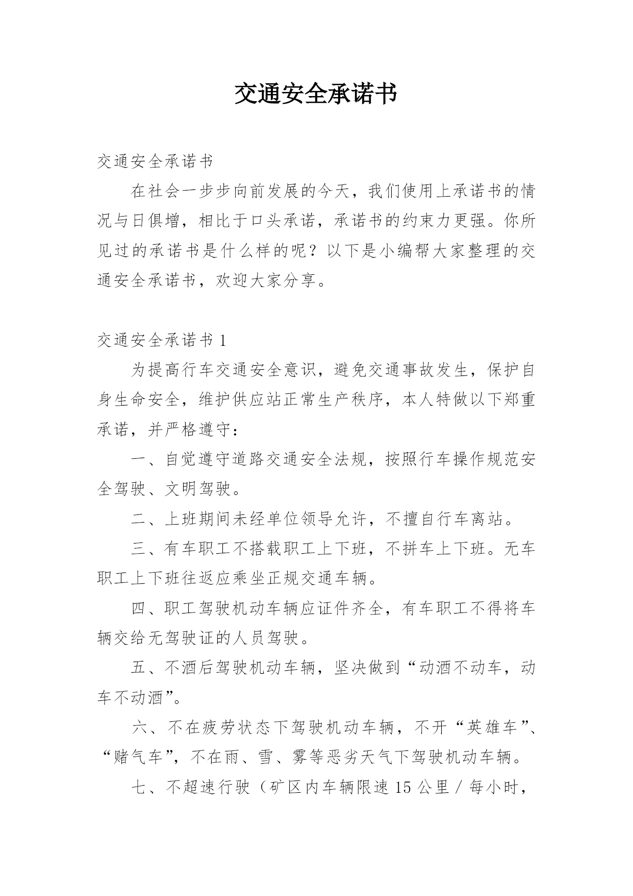 交通安全承诺书交通安全承诺书在社会一步步向前发展的今天,我们使用上承诺书的情况与日俱增,相比于口头承诺,承诺书的约束力更强。你所见过的承诺书是什么样的呢?以下是小编帮大家整理的交通安全承诺书,欢迎大家分享。交通安全承诺书1为提高行车交通安全意识,避免交通事故发生,保护自身生命安全,维护供应站正常生产秩序,本人特做以下郑重承诺,并严格遵守:一、自觉遵守道路交通安全法规,按照行车操作规范安全驾驶、文明驾驶。二、上班期间未经单位领导允许,不擅自行车离站。三、有车职工不搭载职工上下班,不拼车上下班。无车职工上下班