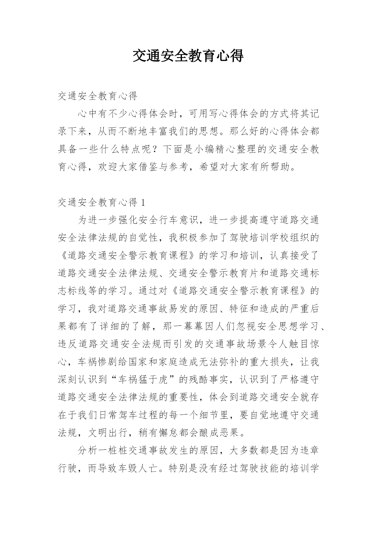 交通安全教育心得交通安全教育心得心中有不少心得体会时,可用写心得体会的方式将其记录下来,从而不断地丰富我们的思想。那么好的心得体会都具备一些什么特点呢?下面是小编精心整理的交通安全教育心得,欢迎大家借鉴与参考,希望对大家有所帮助。交通安全教育心得1为进一步强化安全行车意识,进一步提高遵守道路交通安全法律法规的自觉性,我积极参加了驾驶培训学校组织的《道路交通安全警示教育课程》的学习和培训,认真接受了道路交通安全法律法规、交通安全警示教育片和道路交通标志标线等的学习。通过对《道路交通安全警示教育课程》的学习,