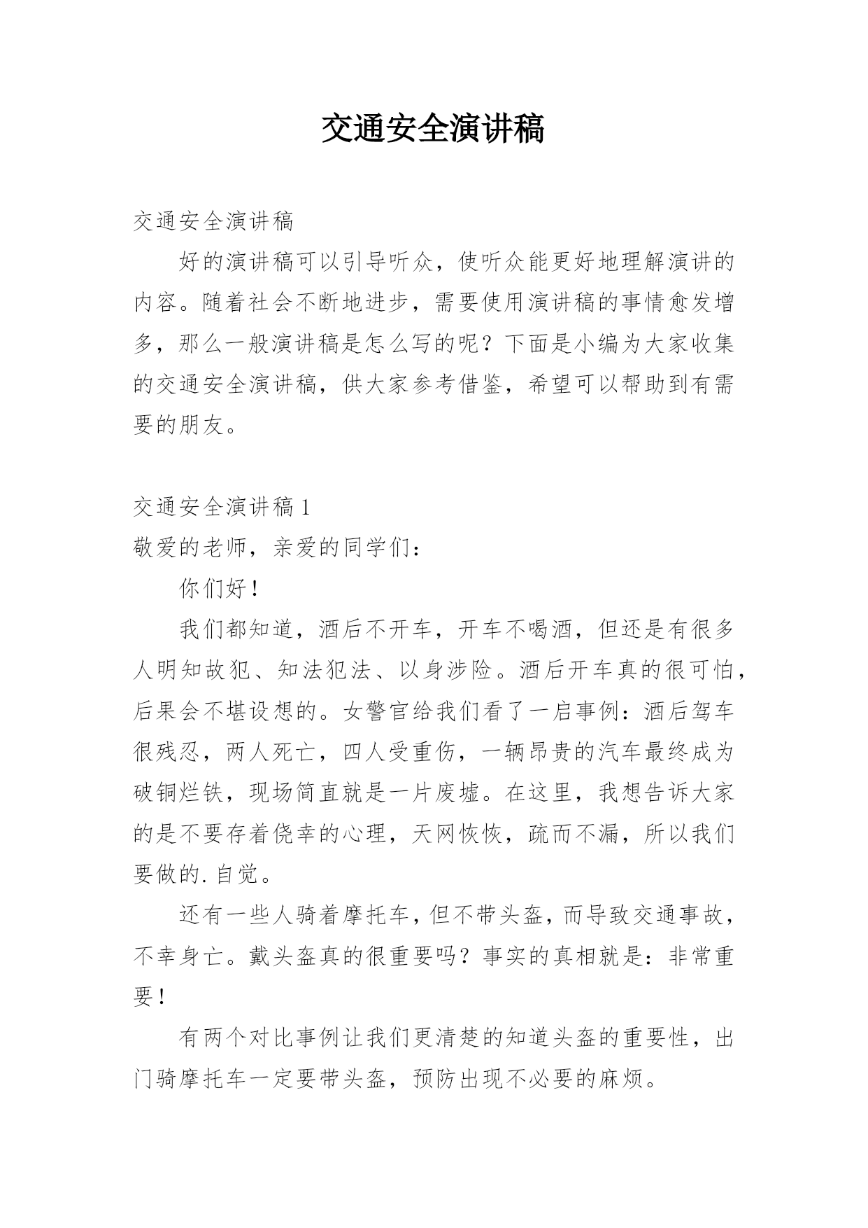 交通安全演讲稿交通安全演讲稿好的演讲稿可以引导听众,使听众能更好地理解演讲的内容。随着社会不断地进步,需要使用演讲稿的事情愈发增多,那么一般演讲稿是怎么写的呢?下面是小编为大家收集的交通安全演讲稿,供大家参考借鉴,希望可以帮助到有需要的朋友。交通安全演讲稿1敬爱的老师,亲爱的同学们:你们好!我们都知道,酒后不开车,开车不喝酒,但还是有很多人明知故犯、知法犯法、以身涉险。酒后开车真的很可怕,后果会不堪设想的。女警官给我们看了一启事例:酒后驾车很残忍,两人死亡,四人受重伤,一辆昂贵的汽车最终成为破铜烂铁,现场