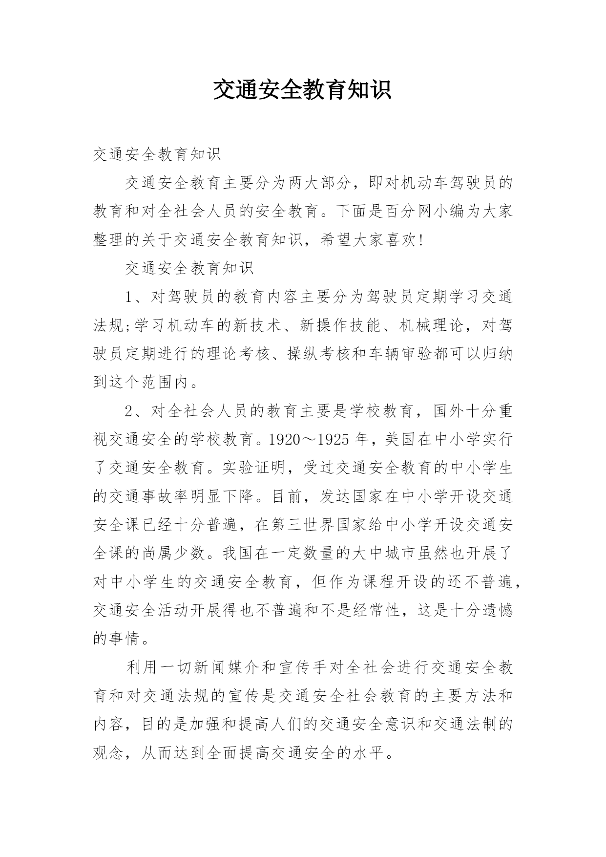 交通安全教育知识交通安全教育知识交通安全教育主要分为两大部分,即对机动车驾驶员的教育和对全社会人员的安全教育。下面是百分网小编为大家整理的关于交通安全教育知识,希望大家喜欢!交通安全教育知识1、对驾驶员的教育内容主要分为驾驶员定期学习交通法规;学习机动车的新技术、新操作技能、机械理论,对驾驶员定期进行的理论考核、操纵考核和车辆审验都可以归纳到这个范围内。2、对全社会人员的教育主要是学校教育,国外十分重视交通安全的学校教育。1920~1925年,美国在中小学实行了交通安全教育。实验证明,受过交通安全教育的中