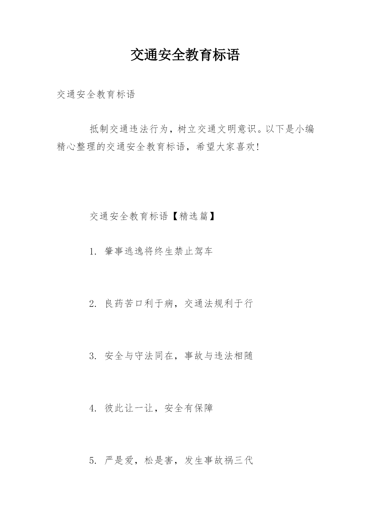 交通安全教育标语交通安全教育标语抵制交通违法行为,树立交通文明意识。以下是小编精心整理的交通安全教育标语,希望大家喜欢!交通安全教育标语【精选篇】1.肇事逃逸将终生禁止驾车2.良药苦口利于病,交通法规利于行3.安全与守法同在,事故与违法相随4.彼此让一让,安全有保障5.严是爱,松是害,发生事故祸三代6.要想效益好,安全最重要7.让与争一闪念,生与死一瞬间8.穿马路越护栏,不守法是隐患9.车好路好,安全最好10.车可修复,人无来生11.法规在心中,平安在手中12.人行道车莫占,车行道人莫穿13."