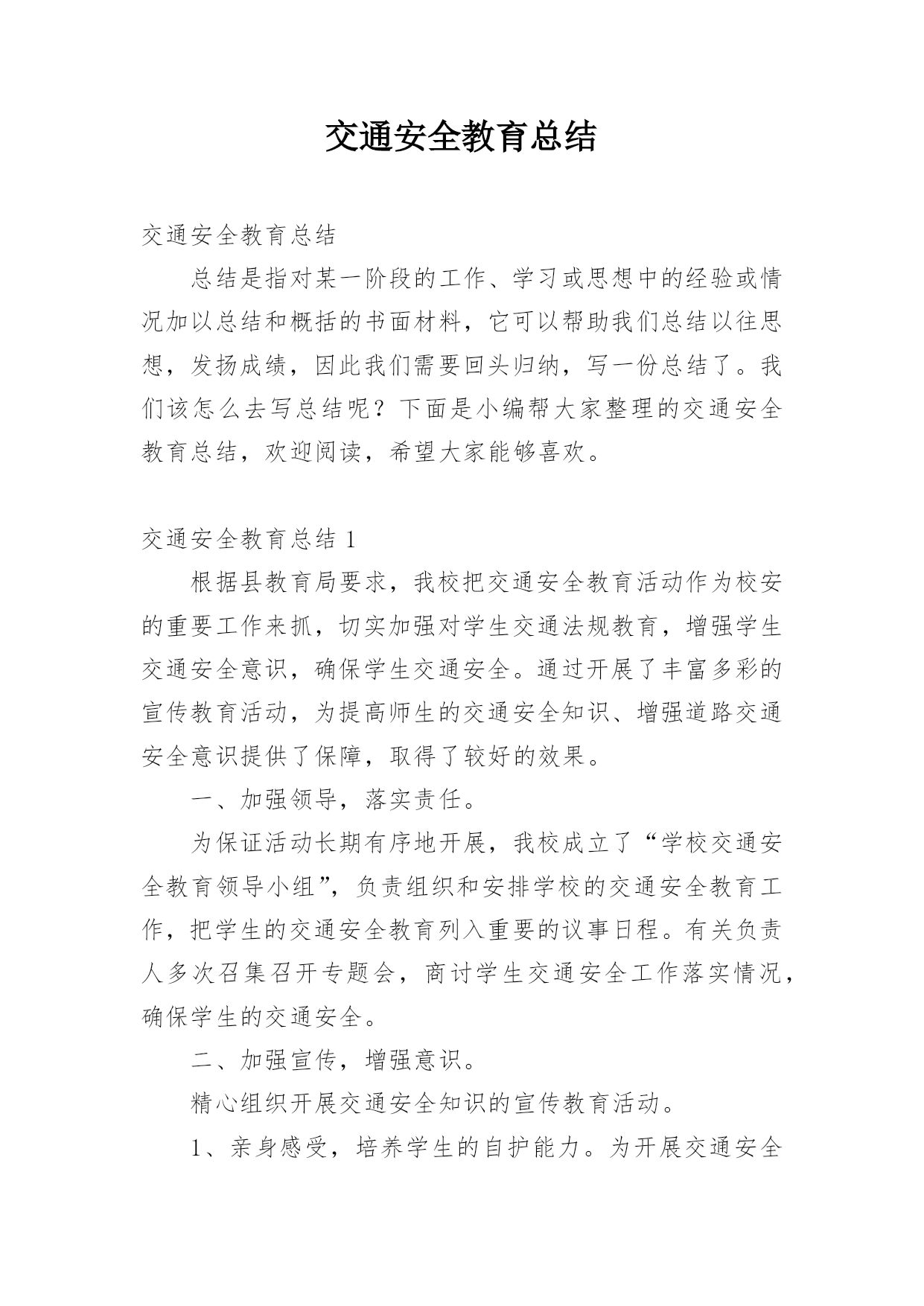 交通安全教育总结交通安全教育总结总结是指对某一阶段的工作、学习或思想中的经验或情况加以总结和概括的书面材料,它可以帮助我们总结以往思想,发扬成绩,因此我们需要回头归纳,写一份总结了。我们该怎么去写总结呢?下面是小编帮大家整理的交通安全教育总结,欢迎阅读,希望大家能够喜欢。交通安全教育总结1根据县教育局要求,我校把交通安全教育活动作为校安的重要工作来抓,切实加强对学生交通法规教育,增强学生交通安全意识,确保学生交通安全。通过开展了丰富多彩的宣传教育活动,为提高师生的交通安全知识、增强道路交通安全意识提供了保