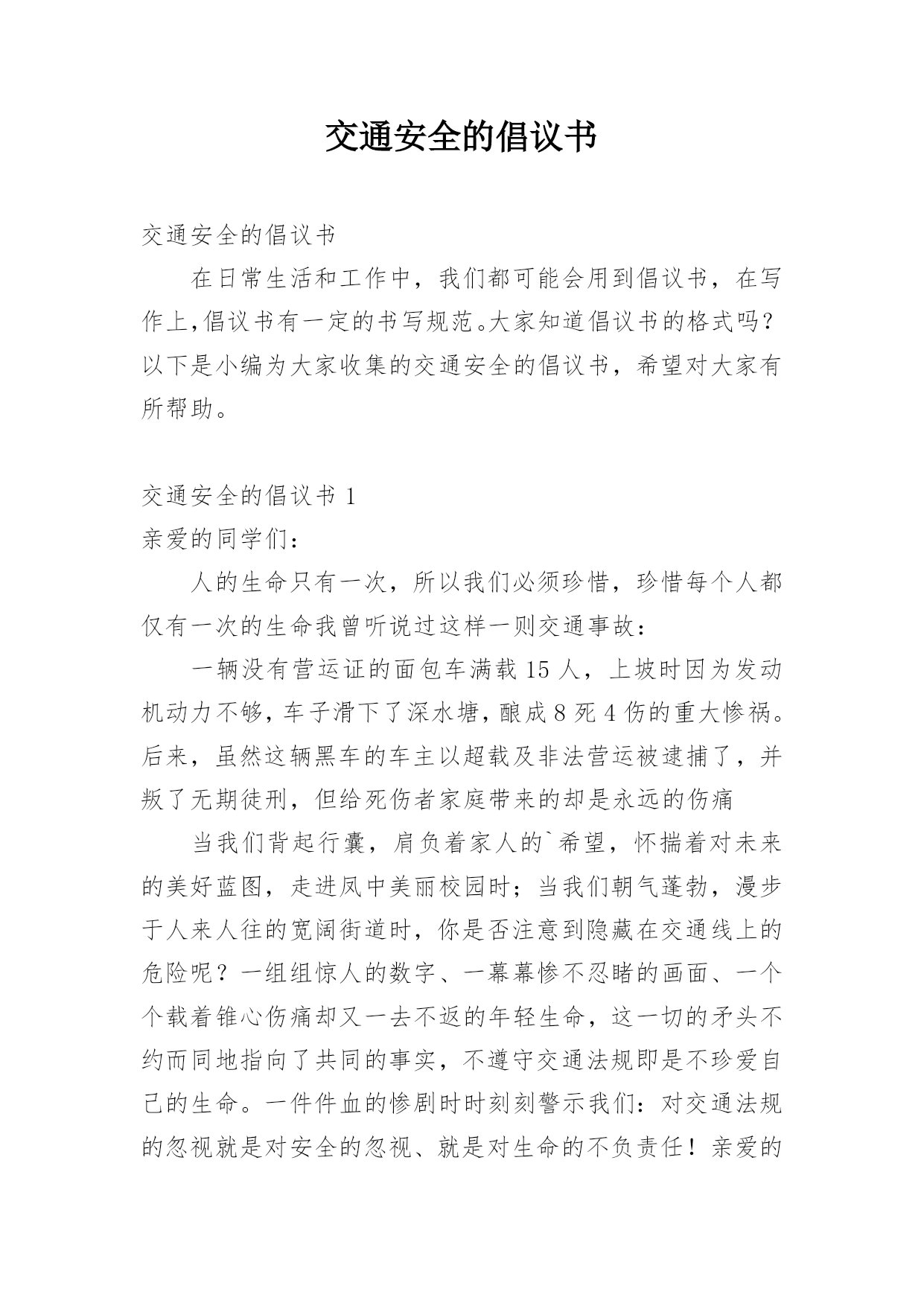 交通安全的倡议书交通安全的倡议书在日常生活和工作中,我们都可能会用到倡议书,在写作上,倡议书有一定的书写规范。大家知道倡议书的格式吗?以下是小编为大家收集的交通安全的倡议书,希望对大家有所帮助。交通安全的倡议书1亲爱的同学们:人的生命只有一次,所以我们必须珍惜,珍惜每个人都仅有一次的生命我曾听说过这样一则交通事故:一辆没有营运证的面包车满载15人,上坡时因为发动机动力不够,车子滑下了深水塘,酿成8死4伤的重大惨祸。后来,虽然这辆黑车的车主以超载及非法营运被逮捕了,并叛了无期徒刑,但给死伤者家庭带来的却是永