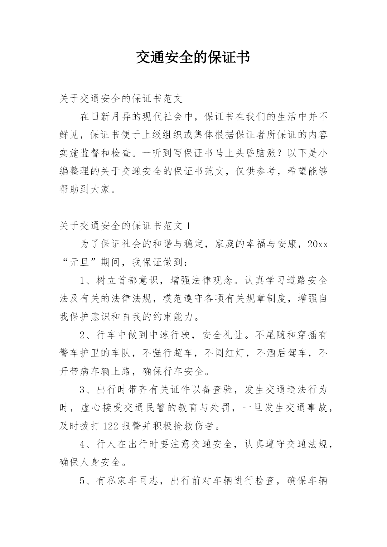 交通安全的保证书关于交通安全的保证书范文在日新月异的现代社会中,保证书在我们的生活中并不鲜见,保证书便于上级组织或集体根据保证者所保证的内容实施监督和检查。一听到写保证书马上头昏脑涨?以下是小编整理的关于交通安全的保证书范文,仅供参考,希望能够帮助到大家。关于交通安全的保证书范文1为了保证社会的和谐与稳定,家庭的幸福与安康,20xx“元旦”期间,我保证做到:1、树立首都意识,增强法律观念。认真学习道路安全法及有关的法律法规,模范遵守各项有关规章制度,增强自我保护意识和自我的约束能力。2、行车中做到中速行驶