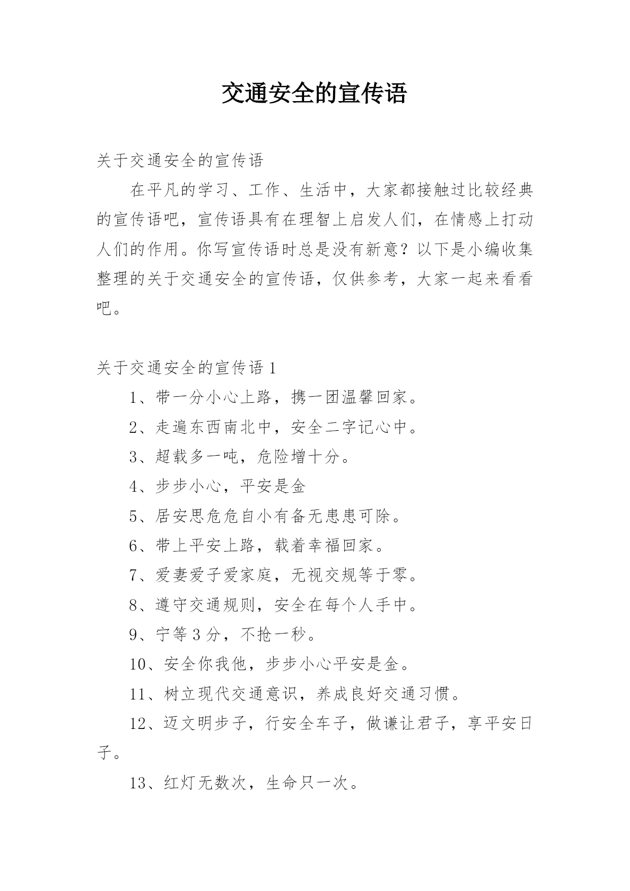 交通安全的宣传语关于交通安全的宣传语在平凡的学习、工作、生活中,大家都接触过比较经典的宣传语吧,宣传语具有在理智上启发人们,在情感上打动人们的作用。你写宣传语时总是没有新意?以下是小编收集整理的关于交通安全的宣传语,仅供参考,大家一起来看看吧。关于交通安全的宣传语11、带一分小心上路,携一团温馨回家。2、走遍东西南北中,安全二字记心中。3、超载多一吨,危险增十分。4、步步小心,平安是金5、居安思危危自小有备无患患可除。6、带上平安上路,载着幸福回家。7、爱妻爱子爱家庭,无视交规等于零。8、遵守交通规则,安
