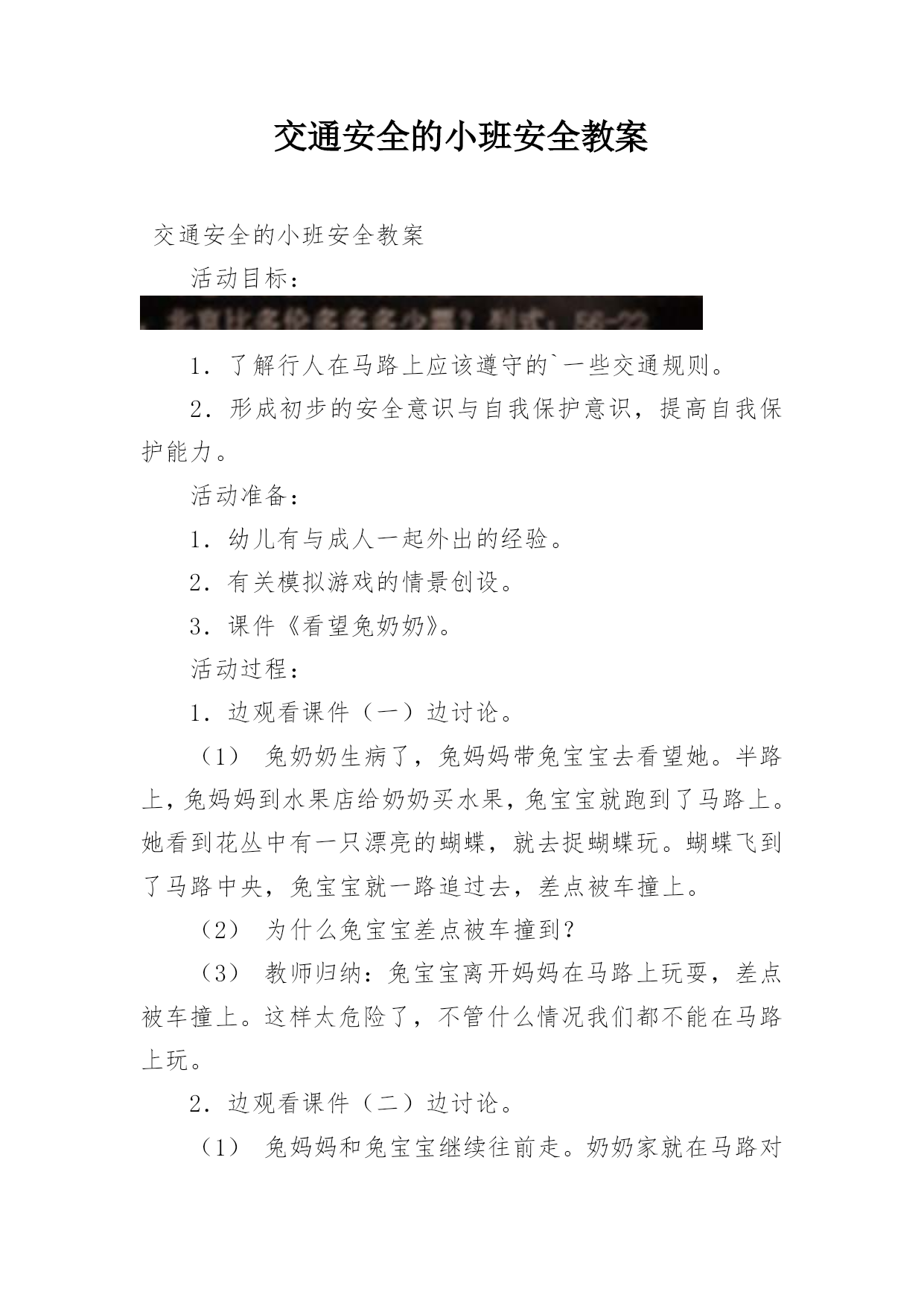 交通安全的小班安全教案交通安全的小班安全教案活动目标:1.了解行人在马路上应该遵守的`一些交通规则。2.形成初步的安全意识与自我保护意识,提高自我保护能力。活动准备:1.幼儿有与成人一起外出的经验。2.有关模拟游戏的情景创设。3.课件《看望兔奶奶》。活动过程:1.边观看课件(一)边讨论。(1)兔奶奶生病了,兔妈妈带兔宝宝去看望她。半路上,兔妈妈到水果店给奶奶买水果,兔宝宝就跑到了马路上。她看到花丛中有一只漂亮的蝴蝶,就去捉蝴蝶玩。蝴蝶飞到了马路中央,兔宝宝就一路追过去,差点被车撞上。(2)为什么兔宝宝差点