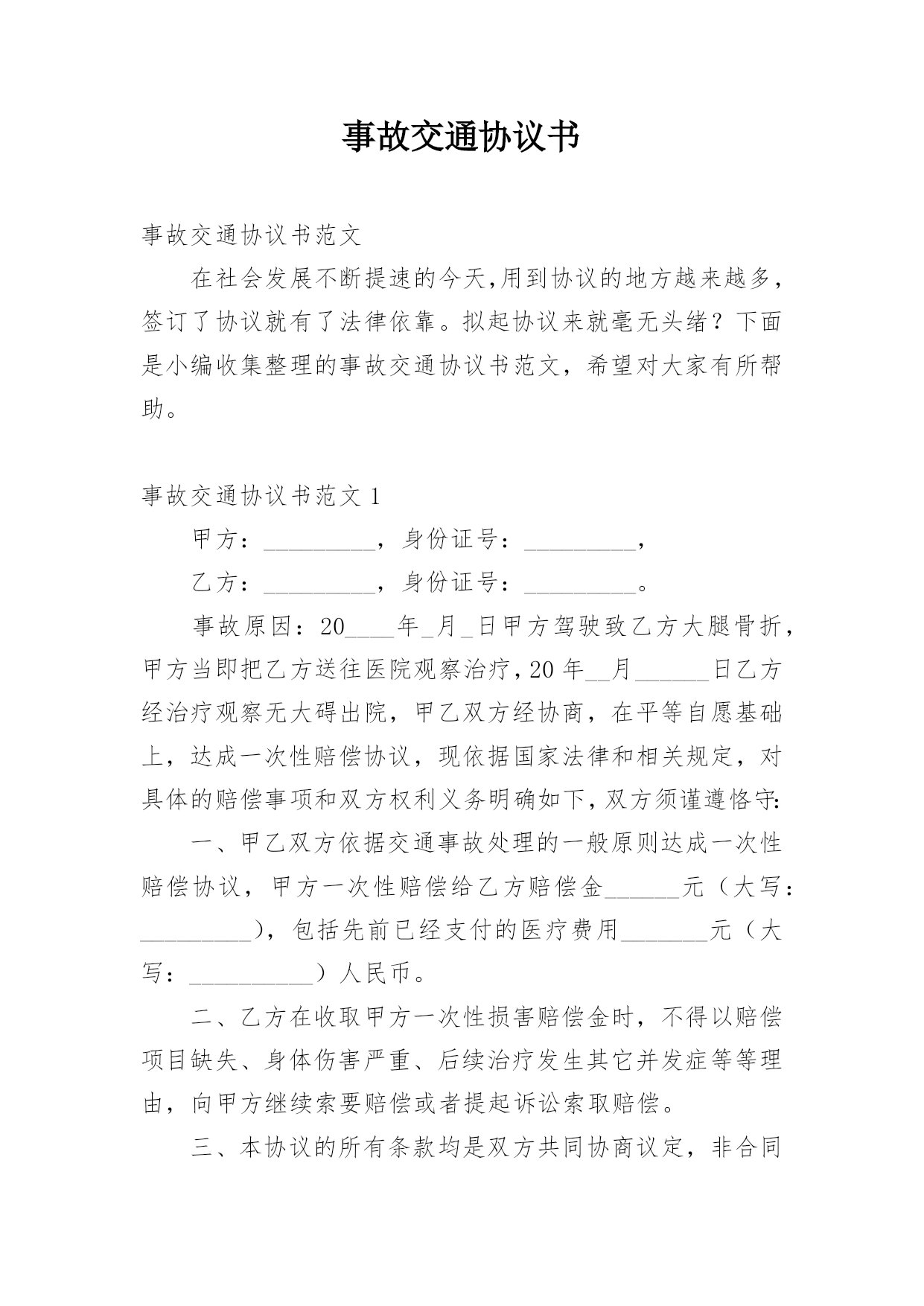 事故交通协议书事故交通协议书范文在社会发展不断提速的今天,用到协议的地方越来越多,签订了协议就有了法律依靠。拟起协议来就毫无头绪?下面是小编收集整理的事故交通协议书范文,希望对大家有所帮助。事故交通协议书范文1甲方:_________,身份证号:_________,乙方:_________,身份证号:_________。事故原因:20____年_月_日甲方驾驶致乙方大腿骨折,甲方当即把乙方送往医院观察治疗,20年__月______日乙方经治疗观察无大碍出院,甲乙双方经协商,在平等自愿基础上,达成一次性赔偿