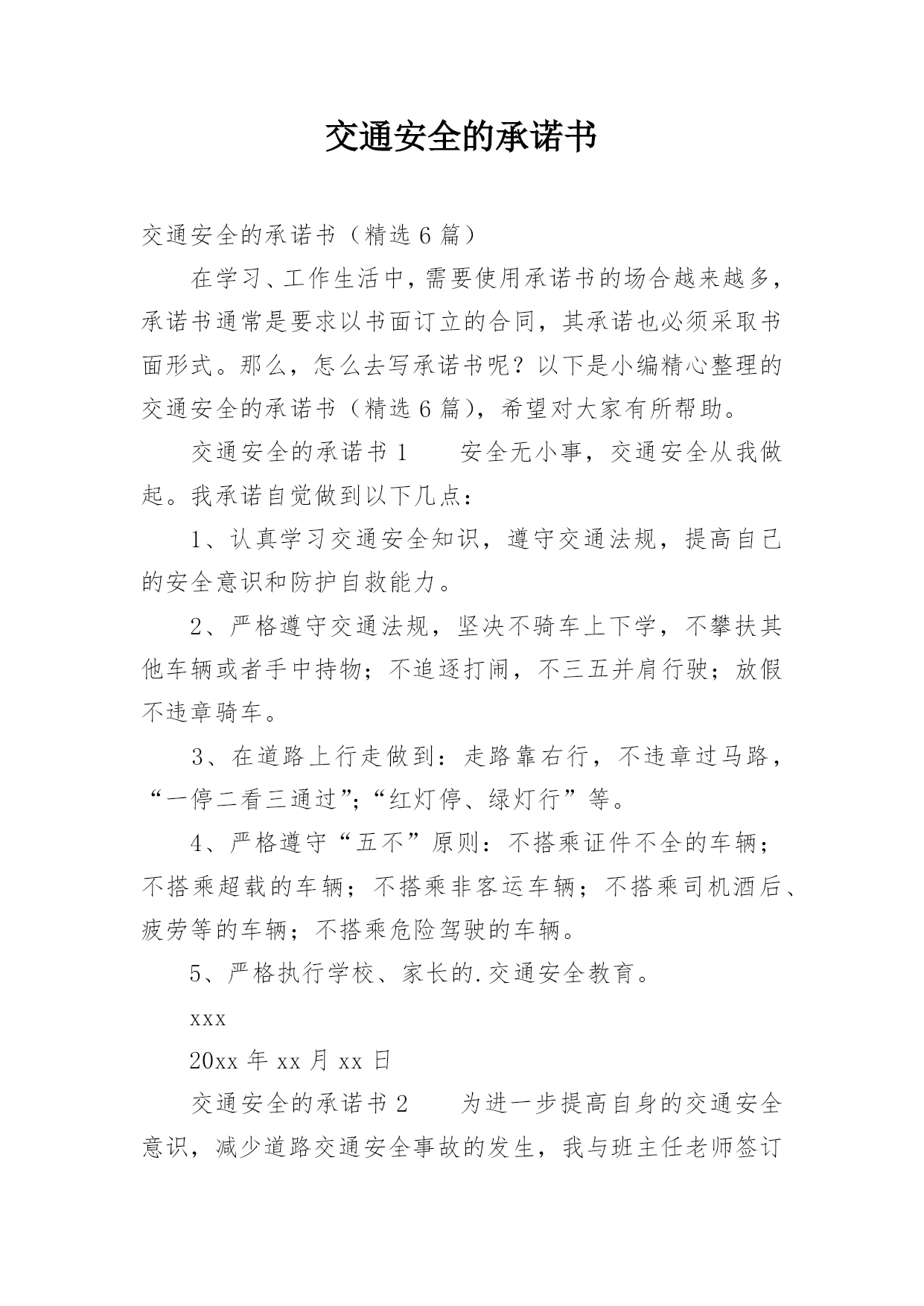 交通安全的承诺书交通安全的承诺书(精选6篇)在学习、工作生活中,需要使用承诺书的场合越来越多,承诺书通常是要求以书面订立的合同,其承诺也必须采取书面形式。那么,怎么去写承诺书呢?以下是小编精心整理的交通安全的承诺书(精选6篇),希望对大家有所帮助。交通安全的承诺书1安全无小事,交通安全从我做起。我承诺自觉做到以下几点:1、认真学习交通安全知识,遵守交通法规,提高自己的安全意识和防护自救能力。2、严格遵守交通法规,坚决不骑车上下学,不攀扶其他车辆或者手中持物;不追逐打闹,不三五并肩行驶;放假不违章骑车。3、