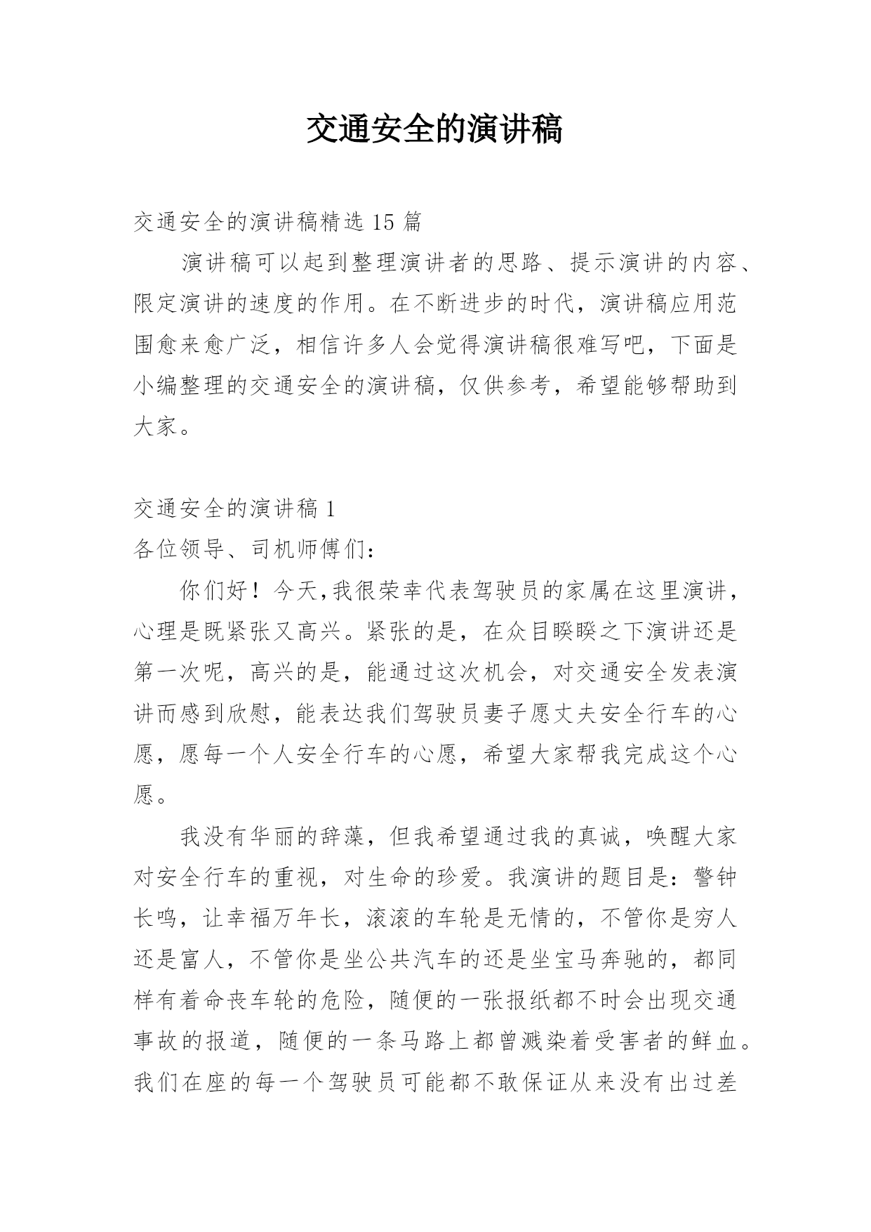 交通安全的演讲稿交通安全的演讲稿精选15篇演讲稿可以起到整理演讲者的思路、提示演讲的内容、限定演讲的速度的作用。在不断进步的时代,演讲稿应用范围愈来愈广泛,相信许多人会觉得演讲稿很难写吧,下面是小编整理的交通安全的演讲稿,仅供参考,希望能够帮助到大家。交通安全的演讲稿1各位领导、司机师傅们:你们好!今天,我很荣幸代表驾驶员的家属在这里演讲,心理是既紧张又高兴。紧张的是,在众目睽睽之下演讲还是第一次呢,高兴的是,能通过这次机会,对交通安全发表演讲而感到欣慰,能表达我们驾驶员妻子愿丈夫安全行车的心愿,愿每一个