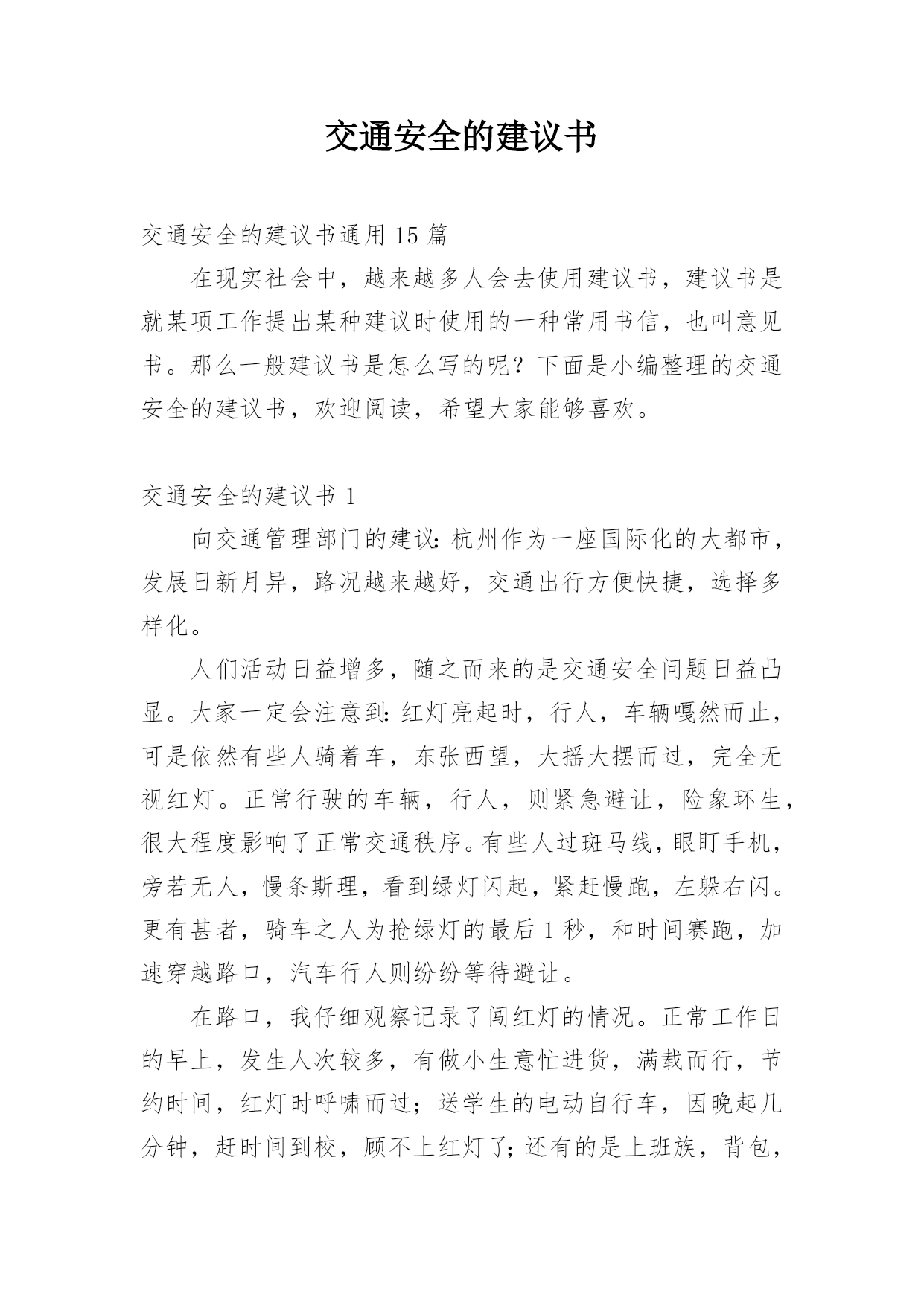 交通安全的建议书交通安全的建议书通用15篇在现实社会中,越来越多人会去使用建议书,建议书是就某项工作提出某种建议时使用的一种常用书信,也叫意见书。那么一般建议书是怎么写的呢?下面是小编整理的交通安全的建议书,欢迎阅读,希望大家能够喜欢。交通安全的建议书1向交通管理部门的建议:杭州作为一座国际化的大都市,发展日新月异,路况越来越好,交通出行方便快捷,选择多样化。人们活动日益增多,随之而来的是交通安全问题日益凸显。大家一定会注意到:红灯亮起时,行人,车辆嘎然而止,可是依然有些人骑着车,东张西望,大摇大摆而过,
