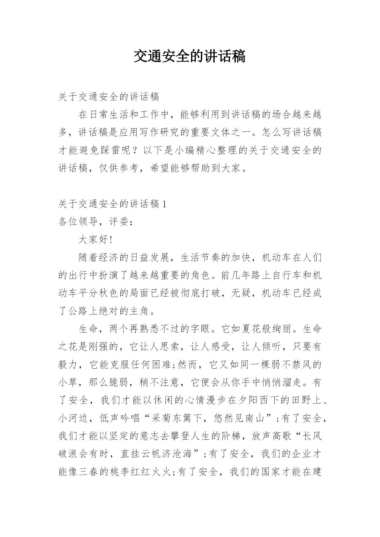 交通安全的讲话稿关于交通安全的讲话稿在日常生活和工作中,能够利用到讲话稿的场合越来越多,讲话稿是应用写作研究的重要文体之一。怎么写讲话稿才能避免踩雷呢?以下是小编精心整理的关于交通安全的讲话稿,仅供参考,希望能够帮助到大家。关于交通安全的讲话稿1各位领导,评委:大家好!随着经济的日益发展,生活节奏的加快,机动车在人们的出行中扮演了越来越重要的角色。前几年路上自行车和机动车平分秋色的局面已经被彻底打破,无疑,机动车已经成了公路上绝对的主角。生命,两个再熟悉不过的字眼。它如夏花般绚丽。生命之花是刚强的,它让人