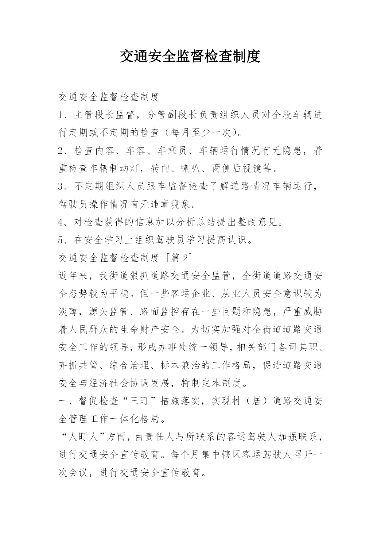 交通安全监督检查制度交通安全监督检查制度1、主管段长监督,分管副段长负责组织人员对全段车辆进行定期或不定期的检查(每月至少一次)。2、检查内容、车容、车乘员、车辆运行情况有无隐患,着重检查车辆制动灯,转向、喇叭、两侧后视镜等。3、不定期组织人员跟车监督检查了解道路情况车辆运行,驾驶员操作情况有无违章现象。4、对检查获得的信息加以分析总结提出整改意见。5、在安全学习上组织驾驶员学习提高认识。交通安全监督检查制度[篇2]近年来,我街道狠抓道路交通安全监管,全街道道路交通安全态势较为平稳。但一些客运企业、从业人