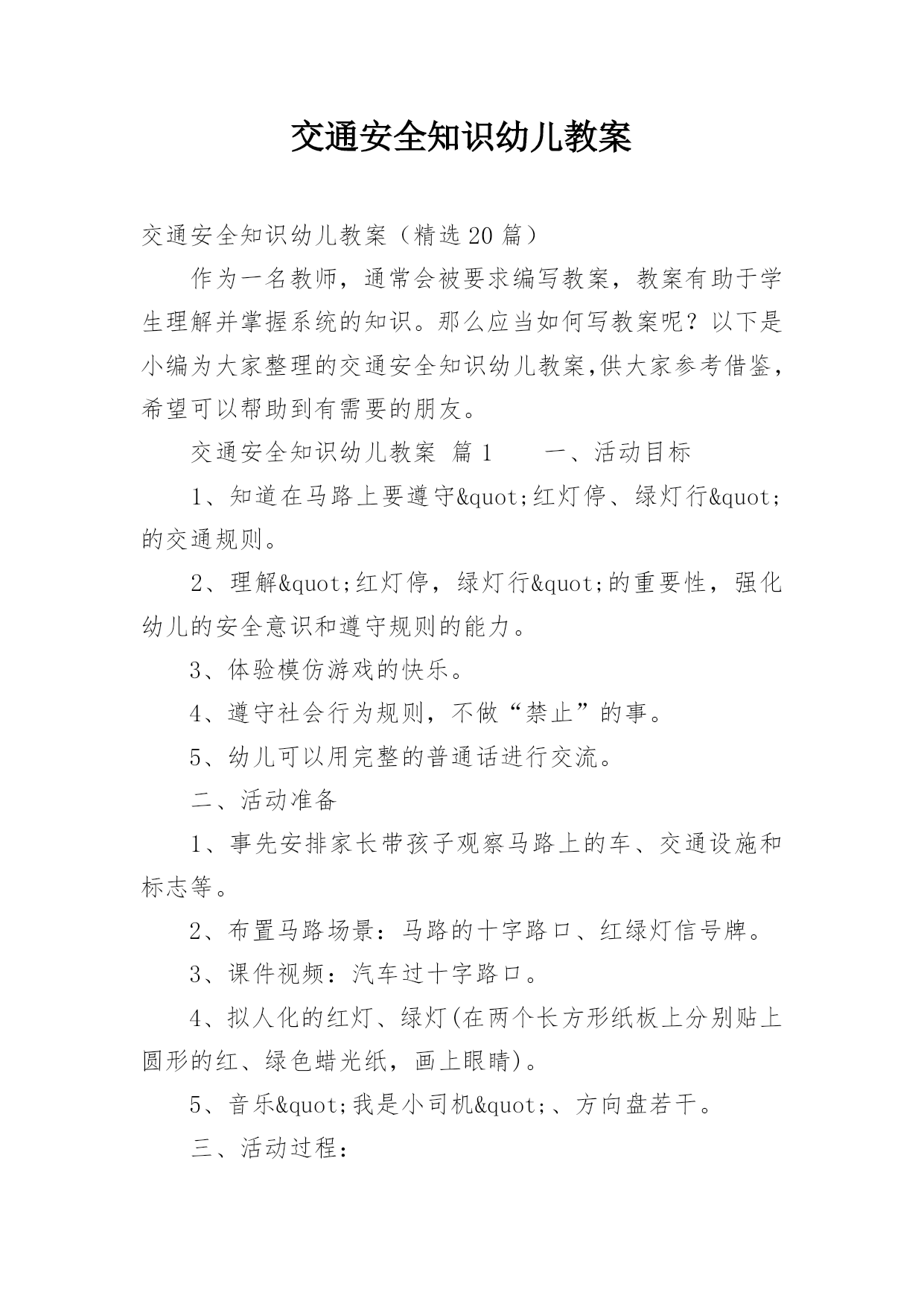 交通安全知识幼儿教案交通安全知识幼儿教案(精选20篇)作为一名教师,通常会被要求编写教案,教案有助于学生理解并掌握系统的知识。那么应当如何写教案呢?以下是小编为大家整理的交通安全知识幼儿教案,供大家参考借鉴,希望可以帮助到有需要的朋友。交通安全知识幼儿教案篇1一、活动目标1、知道在马路上要遵守"红灯停、绿灯行"的交通规则。2、理解"红灯停,绿灯行"的重要性,强化幼儿的安全意识和遵守规则的能力。3、体验模仿游戏的快乐。4、遵守社会行为规则,不做“禁止”的事。5、幼儿可