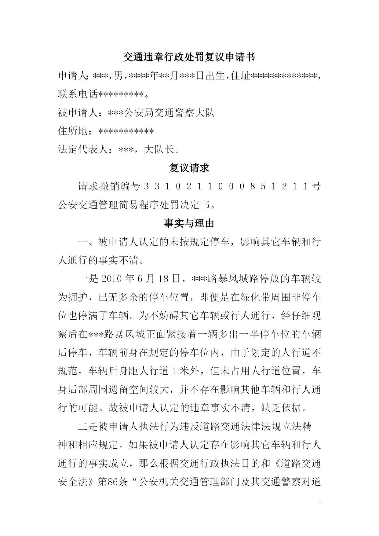PAGEPAGE5交通违章行政处罚复议申请书申请人:***,男,****年**月***日出生,住址*************,联系电话*********。被申请人:***公安局交通警察大队住所地:***********法定代表人:***,大队长。复议请求请求撤销编号3310211000851211号公安交通管理简易程序处罚决定书。事实与理由被申请人认定的未按规定停车,影响其它车辆和行人通行的事实不清。一是2010年6月18日,***路暴风城路停放的车辆较为拥护,已无多余的停车位置,即便是在绿化