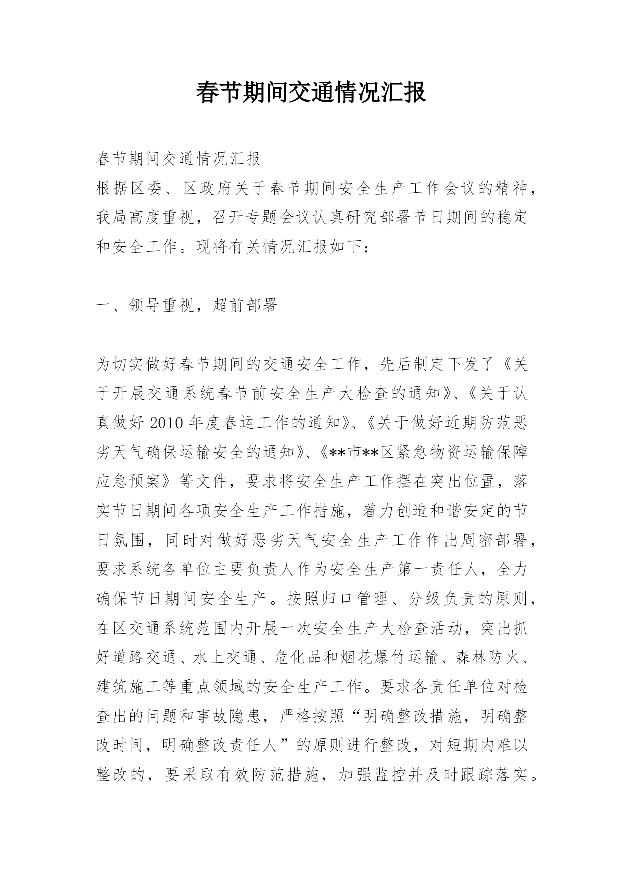 春节期间交通情况汇报春节期间交通情况汇报根据区委、区政府关于春节期间安全生产工作会议的精神,我局高度重视,召开专题会议认真研究部署节日期间的稳定和安全工作。现将有关情况汇报如下:一、领导重视,超前部署为切实做好春节期间的交通安全工作,先后制定下发了《关于开展交通系统春节前安全生产大检查的通知》、《关于认真做好2010年度春运工作的通知》、《关于做好近期防范恶劣天气确保运输安全的通知》、《**市**区紧急物资运输保障应急预案》等文件,要求将安全生产工作摆在突出位置,落实节日期间各项安全生产工作措施,着力创造