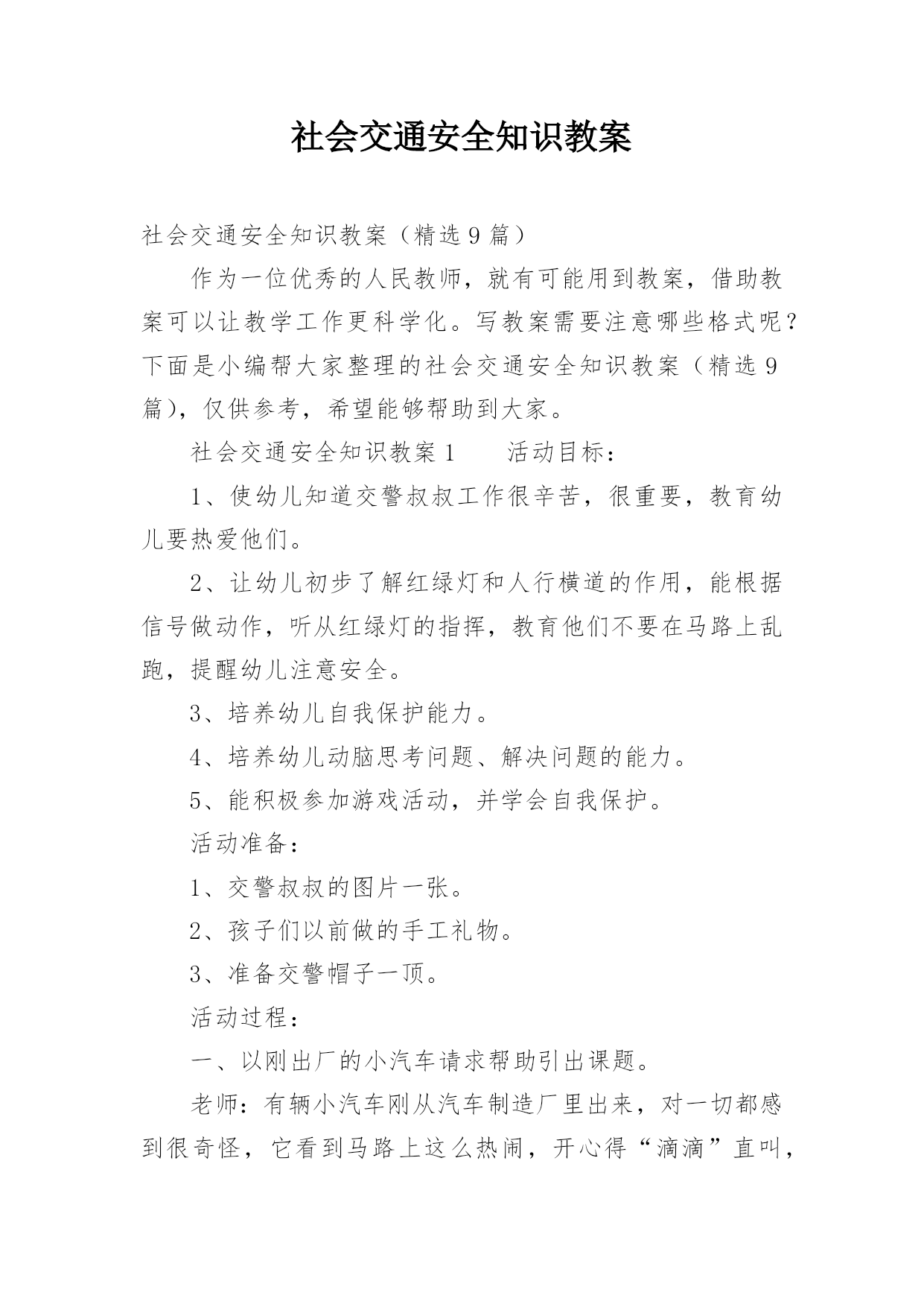 社会交通安全知识教案社会交通安全知识教案(精选9篇)作为一位优秀的人民教师,就有可能用到教案,借助教案可以让教学工作更科学化。写教案需要注意哪些格式呢?下面是小编帮大家整理的社会交通安全知识教案(精选9篇),仅供参考,希望能够帮助到大家。社会交通安全知识教案1活动目标:1、使幼儿知道交警叔叔工作很辛苦,很重要,教育幼儿要热爱他们。2、让幼儿初步了解红绿灯和人行横道的作用,能根据信号做动作,听从红绿灯的指挥,教育他们不要在马路上乱跑,提醒幼儿注意安全。3、培养幼儿自我保护能力。4、培养幼儿动脑思考问题、解决