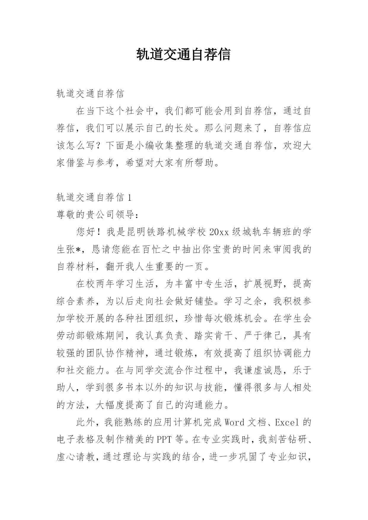 轨道交通自荐信轨道交通自荐信在当下这个社会中,我们都可能会用到自荐信,通过自荐信,我们可以展示自己的长处。那么问题来了,自荐信应该怎么写?下面是小编收集整理的轨道交通自荐信,欢迎大家借鉴与参考,希望对大家有所帮助。轨道交通自荐信1尊敬的贵公司领导:您好!我是昆明铁路机械学校20xx级城轨车辆班的学生张*,恳请您能在百忙之中抽出你宝贵的时间来审阅我的自荐材料,翻开我人生重要的一页。在校两年学习生活,为丰富中专生活,扩展视野,提高综合素养,为以后走向社会做好铺垫。学习之余,我积极参加学校开展的各种社团组织,珍