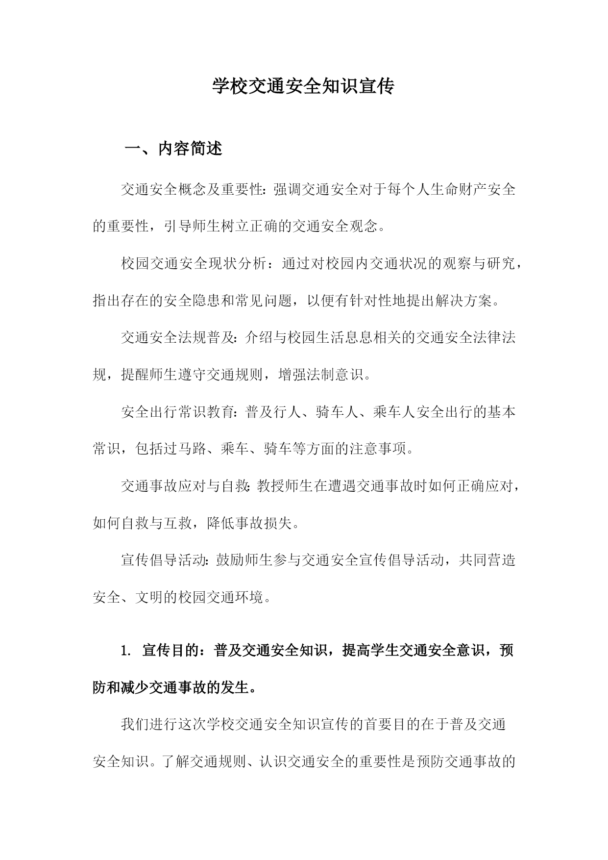 学校交通安全知识宣传一、内容简述交通安全概念及重要性:强调交通安全对于每个人生命财产安全的重要性,引导师生树立正确的交通安全观念。校园交通安全现状分析:通过对校园内交通状况的观察与研究,指出存在的安全隐患和常见问题,以便有针对性地提出解决方案。交通安全法规普及:介绍与校园生活息息相关的交通安全法律法规,提醒师生遵守交通规则,增强法制意识。安全出行常识教育:普及行人、骑车人、乘车人安全出行的基本常识,包括过马路、乘车、骑车等方面的注意事项。交通事故应对与自救:教授师生在遭遇交通事故时如何正确应对,如何自救与