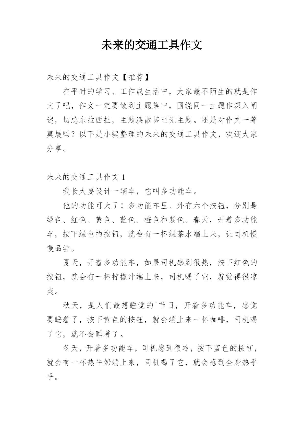 未来的交通工具作文未来的交通工具作文【推荐】在平时的学习、工作或生活中,大家最不陌生的就是作文了吧,作文一定要做到主题集中,围绕同一主题作深入阐述,切忌东拉西扯,主题涣散甚至无主题。还是对作文一筹莫展吗?以下是小编整理的未来的交通工具作文,欢迎大家分享。未来的交通工具作文1我长大要设计一辆车,它叫多功能车。他的功能可大了!多功能车里、外有六个按钮,分别是绿色、红色、黄色、蓝色、橙色和紫色。春天,开着多功能车,按下绿色的按钮,就会有一杯绿茶水端上来,让司机慢慢品尝。夏天,开着多功能车,如果司机感到很热,按下