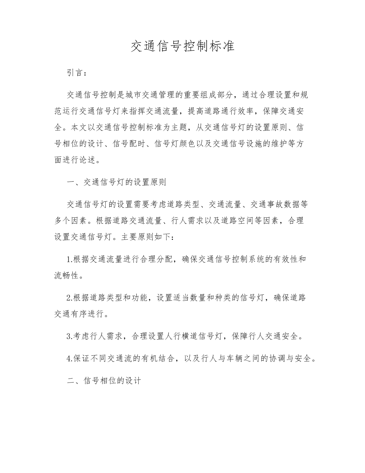 交通信号控制标准引言:交通信号控制是城市交通管理的重要组成部分,通过合理设置和规范运行交通信号灯来指挥交通流量,提高道路通行效率,保障交通安全。本文以交通信号控制标准为主题,从交通信号灯的设置原则、信号相位的设计、信号配时、信号灯颜色以及交通信号设施的维护等方面进行论述。一、交通信号灯的设置原则交通信号灯的设置需要考虑道路类型、交通流量、交通事故数据等多个因素。根据道路交通流量、行人需求以及道路空间等因素,合理设置交通信号灯。主要原则如下:1.根据交通流量进行合理分配,确保交通信号控制系统的有效性和流畅性