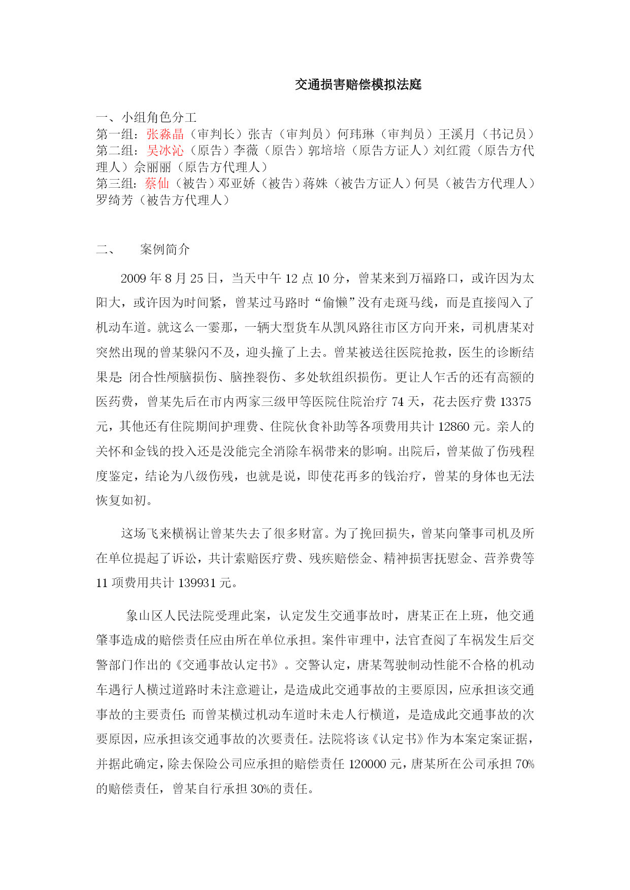 交通损害赔偿模拟法庭一、小组角色分工第一组:张淼晶(审判长)张吉(审判员)何玮琳(审判员)王溪月(书记员)第二组:吴冰沁(原告)李薇(原告)郭培培(原告方证人)刘红霞(原告方代理人)佘丽丽(原告方代理人)第三组:蔡仙(被告)邓亚娇(被告)蒋姝(被告方证人)何昊(被告方代理人)罗绮芳(被告方代理人)案例简介2009年8月25日,当天中午12点10分,曾某来到万福路口,或许因为太阳大,或许因为时间紧,曾某过马路时“偷懒”没有走斑马线,而是直接闯入了机动车道。就这么一霎那,一辆大型货车从凯风路往市区方向开来,司