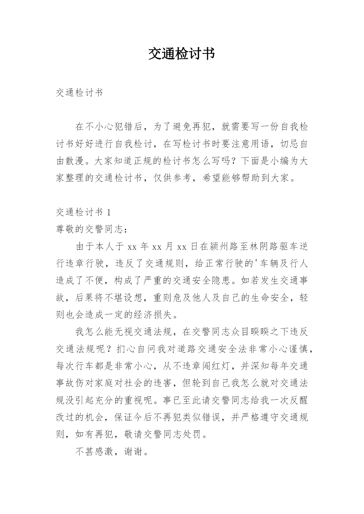 交通检讨书交通检讨书在不小心犯错后,为了避免再犯,就需要写一份自我检讨书好好进行自我检讨,在写检讨书时要注意用语,切忌自由散漫。大家知道正规的检讨书怎么写吗?下面是小编为大家整理的交通检讨书,仅供参考,希望能够帮助到大家。交通检讨书1尊敬的交警同志:由于本人于xx年xx月xx日在颍州路至林阴路驱车逆行违章行驶,违反了交通规则,给正常行驶的'车辆及行人造成了不便,构成了严重的交通安全隐患。如若发生交通事故,后果将不堪设想,重则危及他人及自己的生命安全,轻则也会造成一定的经济损失。我怎么能无视交通法规,在交警
