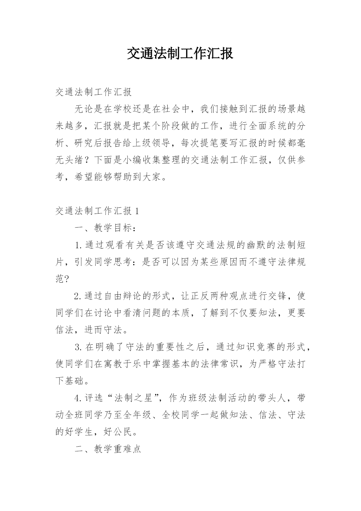 交通法制工作汇报交通法制工作汇报无论是在学校还是在社会中,我们接触到汇报的场景越来越多,汇报就是把某个阶段做的工作,进行全面系统的分析、研究后报告给上级领导,每次提笔要写汇报的时候都毫无头绪?下面是小编收集整理的交通法制工作汇报,仅供参考,希望能够帮助到大家。交通法制工作汇报1一、教学目标:1.通过观看有关是否该遵守交通法规的幽默的法制短片,引发同学思考:是否可以因为某些原因而不遵守法律规范?2.通过自由辩论的形式,让正反两种观点进行交锋,使同学们在讨论中看清问题的本质,了解到不仅要知法,更要信法,进而守