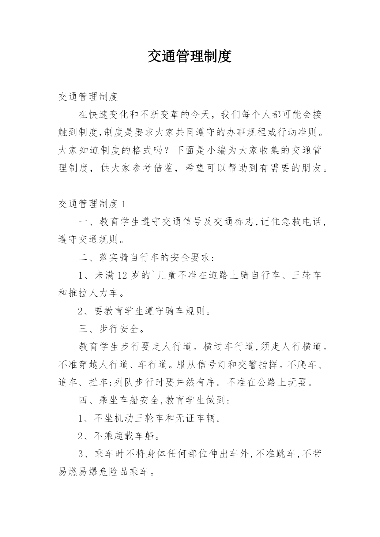 交通管理制度交通管理制度在快速变化和不断变革的今天,我们每个人都可能会接触到制度,制度是要求大家共同遵守的办事规程或行动准则。大家知道制度的格式吗?下面是小编为大家收集的交通管理制度,供大家参考借鉴,希望可以帮助到有需要的朋友。交通管理制度1一、教育学生遵守交通信号及交通标志,记住急救电话,遵守交通规则。二、落实骑自行车的安全要求:1、未满12岁的`儿童不准在道路上骑自行车、三轮车和推拉人力车。2、要教育学生遵守骑车规则。三、步行安全。教育学生步行要走人行道。横过车行道,须走人行横道。不准穿越人行道、车行
