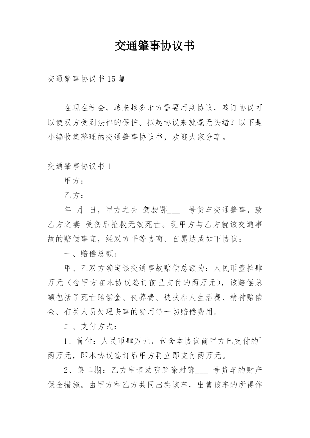 交通肇事协议书交通肇事协议书15篇在现在社会,越来越多地方需要用到协议,签订协议可以使双方受到法律的保护。拟起协议来就毫无头绪?以下是小编收集整理的交通肇事协议书,欢迎大家分享。交通肇事协议书1甲方:乙方:年月日,甲方之夫驾驶鄂___号货车交通肇事,致乙方之妻受伤后抢救无效死亡。现甲方与乙方就该交通事故的赔偿事宜,经双方平等协商、自愿达成如下协议:一、赔偿总额:甲、乙双方确定该交通事故赔偿总额为:人民币壹拾肆万元(含甲方在本协议签订前已支付的两万元),该赔偿总额包括了死亡赔偿金、丧葬费、被扶养人生活费、精