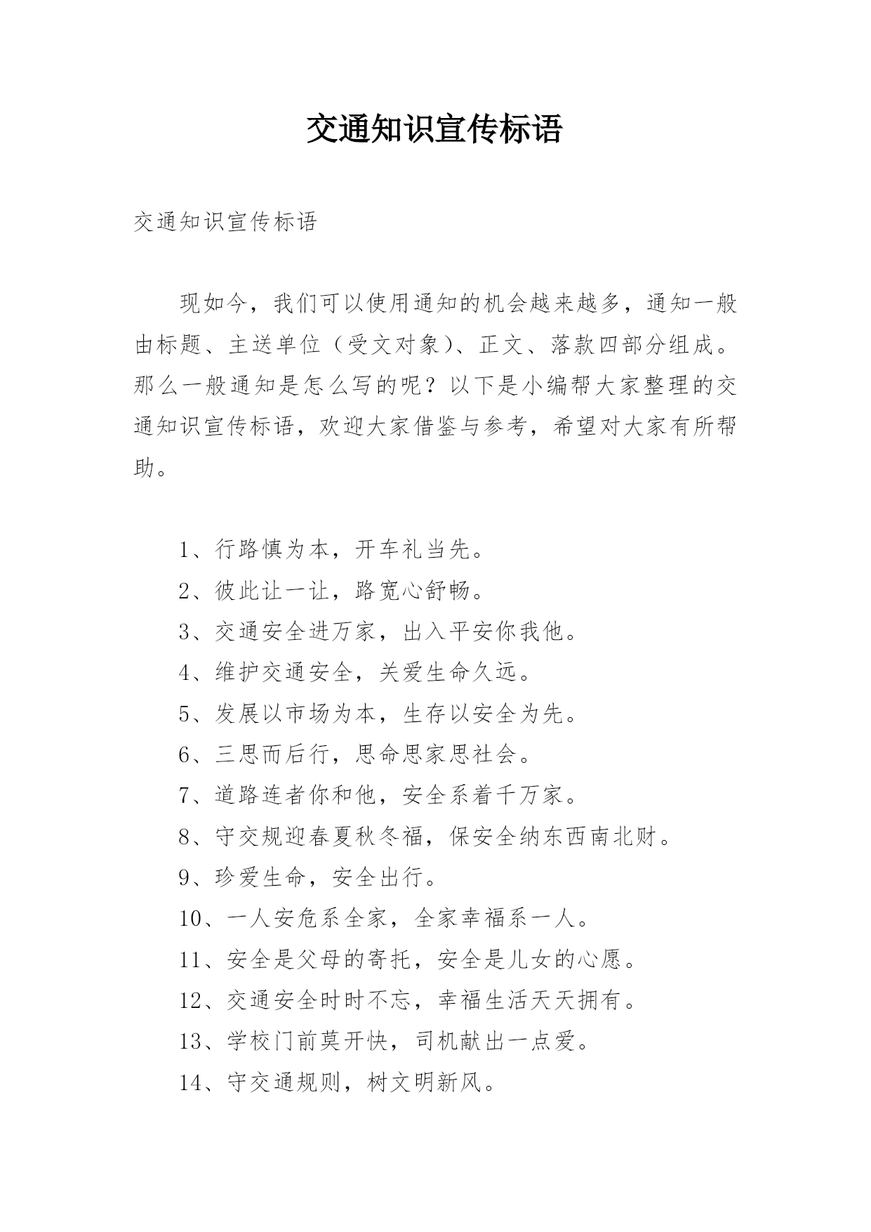 交通知识宣传标语交通知识宣传标语现如今,我们可以使用通知的机会越来越多,通知一般由标题、主送单位(受文对象)、正文、落款四部分组成。那么一般通知是怎么写的呢?以下是小编帮大家整理的交通知识宣传标语,欢迎大家借鉴与参考,希望对大家有所帮助。1、行路慎为本,开车礼当先。2、彼此让一让,路宽心舒畅。3、交通安全进万家,出入平安你我他。4、维护交通安全,关爱生命久远。5、发展以市场为本,生存以安全为先。6、三思而后行,思命思家思社会。7、道路连者你和他,安全系着千万家。8、守交规迎春夏秋冬福,保安全纳东西南北财。