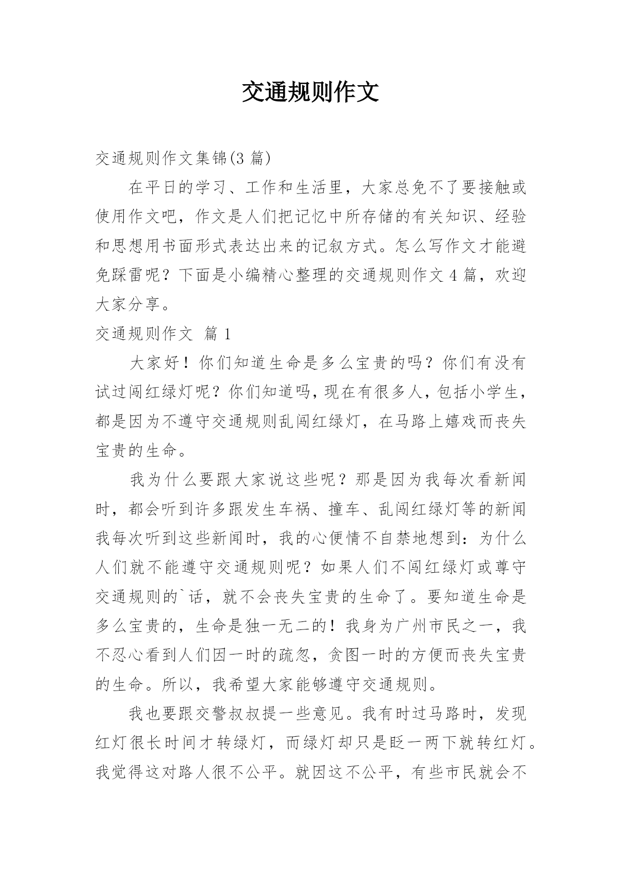 交通规则作文交通规则作文集锦(3篇)在平日的学习、工作和生活里,大家总免不了要接触或使用作文吧,作文是人们把记忆中所存储的有关知识、经验和思想用书面形式表达出来的记叙方式。怎么写作文才能避免踩雷呢?下面是小编精心整理的交通规则作文4篇,欢迎大家分享。交通规则作文篇1大家好!你们知道生命是多么宝贵的吗?你们有没有试过闯红绿灯呢?你们知道吗,现在有很多人,包括小学生,都是因为不遵守交通规则乱闯红绿灯,在马路上嬉戏而丧失宝贵的生命。我为什么要跟大家说这些呢?那是因为我每次看新闻时,都会听到许多跟发生车祸、撞车、