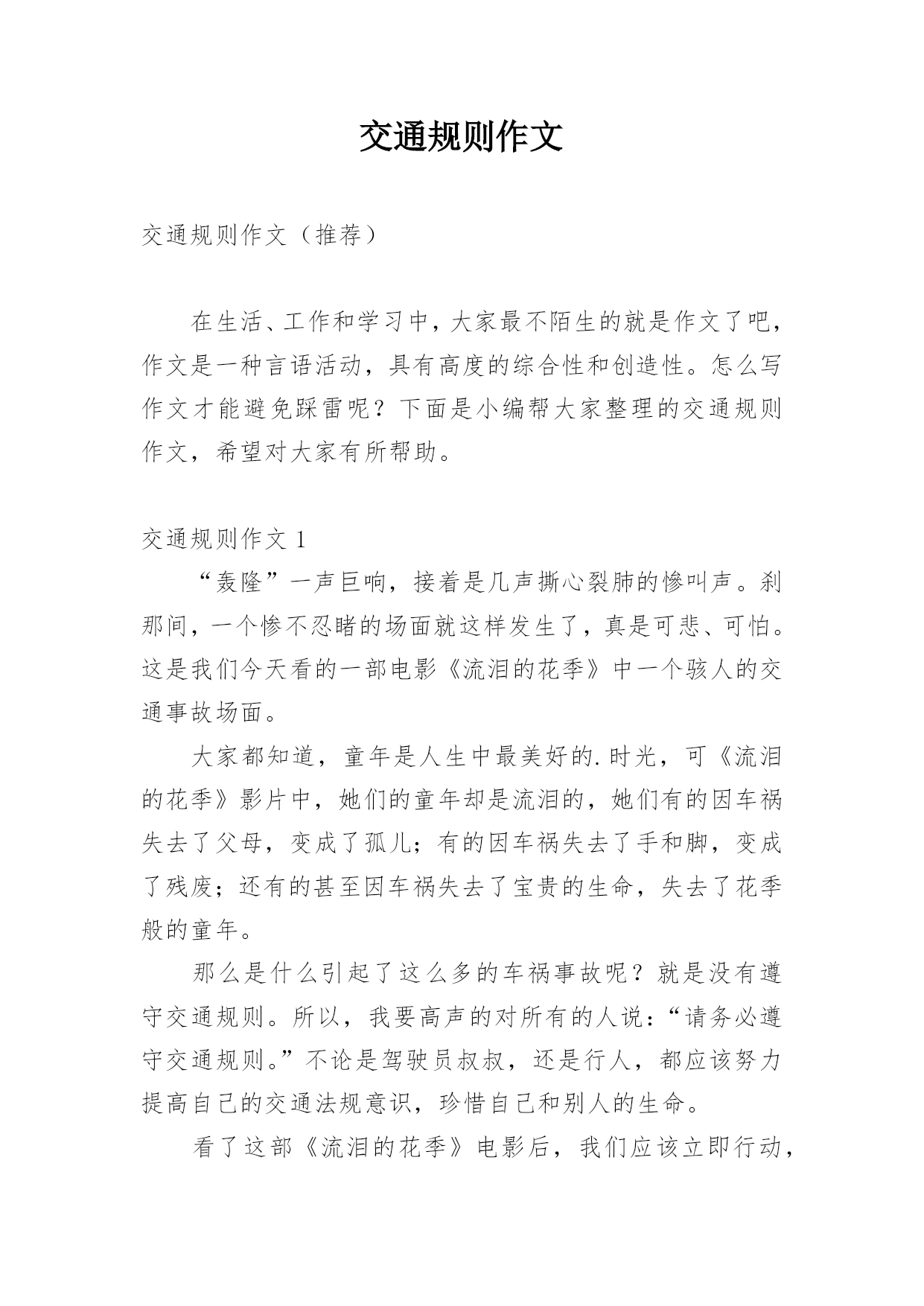 交通规则作文交通规则作文(推荐)在生活、工作和学习中,大家最不陌生的就是作文了吧,作文是一种言语活动,具有高度的综合性和创造性。怎么写作文才能避免踩雷呢?下面是小编帮大家整理的交通规则作文,希望对大家有所帮助。交通规则作文1“轰隆”一声巨响,接着是几声撕心裂肺的慘叫声。刹那间,一个惨不忍睹的场面就这样发生了,真是可悲、可怕。这是我们今天看的一部电影《流泪的花季》中一个骇人的交通事故场面。大家都知道,童年是人生中最美好的.时光,可《流泪的花季》影片中,她们的童年却是流泪的,她们有的因车祸失去了父母,变成了孤