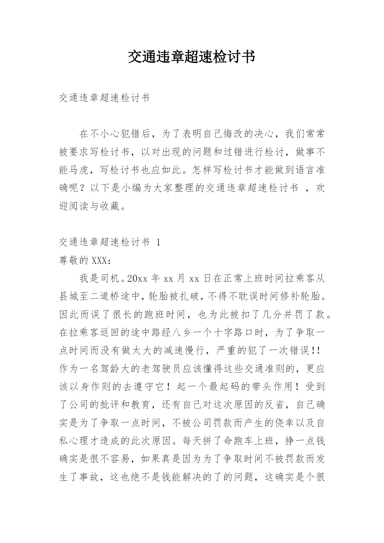 交通违章超速检讨书交通违章超速检讨书在不小心犯错后,为了表明自己悔改的决心,我们常常被要求写检讨书,以对出现的问题和过错进行检讨,做事不能马虎,写检讨书也应如此。怎样写检讨书才能做到语言准确呢?以下是小编为大家整理的交通违章超速检讨书,欢迎阅读与收藏。交通违章超速检讨书1尊敬的XXX:我是司机。20xx年xx月xx日在正常上班时间拉乘客从县城至二道桥途中,轮胎被扎破,不得不耽误时间修补轮胎。因此而误了很长的跑班时间,也为此被扣了几分并罚了款。在拉乘客返回的途中路经八乡一个十字路口时,为了争取一点时间而没有