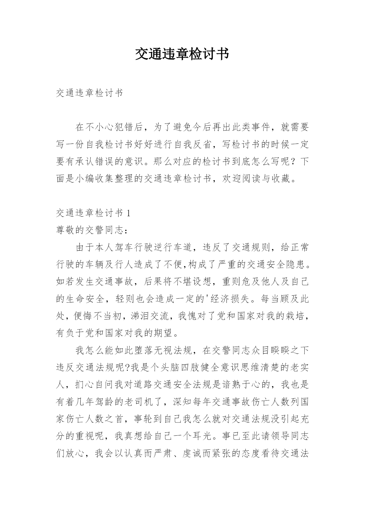 交通违章检讨书交通违章检讨书在不小心犯错后,为了避免今后再出此类事件,就需要写一份自我检讨书好好进行自我反省,写检讨书的时候一定要有承认错误的意识。那么对应的检讨书到底怎么写呢?下面是小编收集整理的交通违章检讨书,欢迎阅读与收藏。交通违章检讨书1尊敬的交警同志:由于本人驾车行驶逆行车道,违反了交通规则,给正常行驶的车辆及行人造成了不便,构成了严重的交通安全隐患。如若发生交通事故,后果将不堪设想,重则危及他人及自己的生命安全,轻则也会造成一定的'经济损失。每当顾及此处,便悔不当初,涕泪交流,我愧对了党和国家