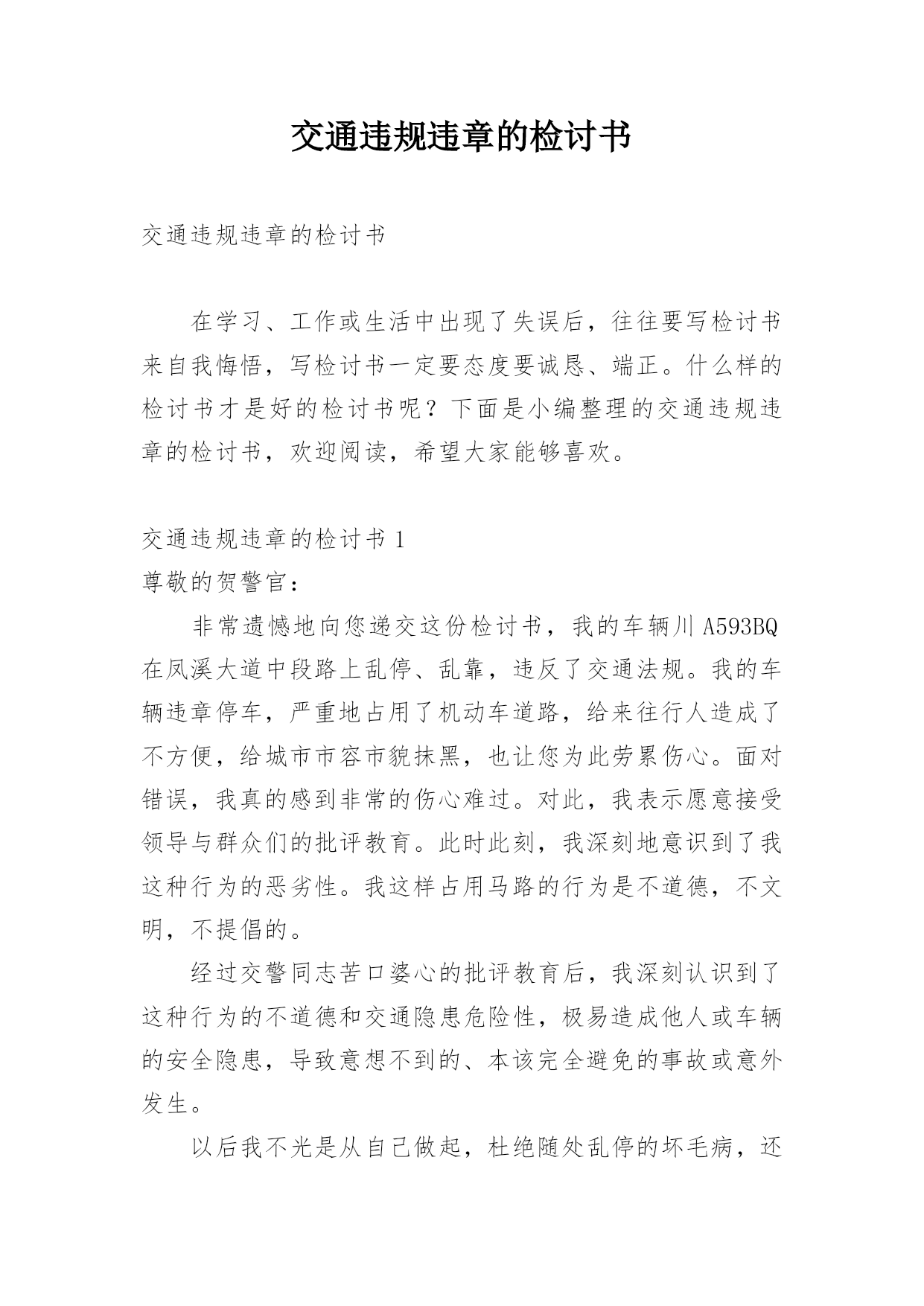 交通违规违章的检讨书交通违规违章的检讨书在学习、工作或生活中出现了失误后,往往要写检讨书来自我悔悟,写检讨书一定要态度要诚恳、端正。什么样的检讨书才是好的检讨书呢?下面是小编整理的交通违规违章的检讨书,欢迎阅读,希望大家能够喜欢。交通违规违章的检讨书1尊敬的贺警官:非常遗憾地向您递交这份检讨书,我的车辆川A593BQ在凤溪大道中段路上乱停、乱靠,违反了交通法规。我的车辆违章停车,严重地占用了机动车道路,给来往行人造成了不方便,给城市市容市貌抹黑,也让您为此劳累伤心。面对错误,我真的感到非常的伤心难过。对此