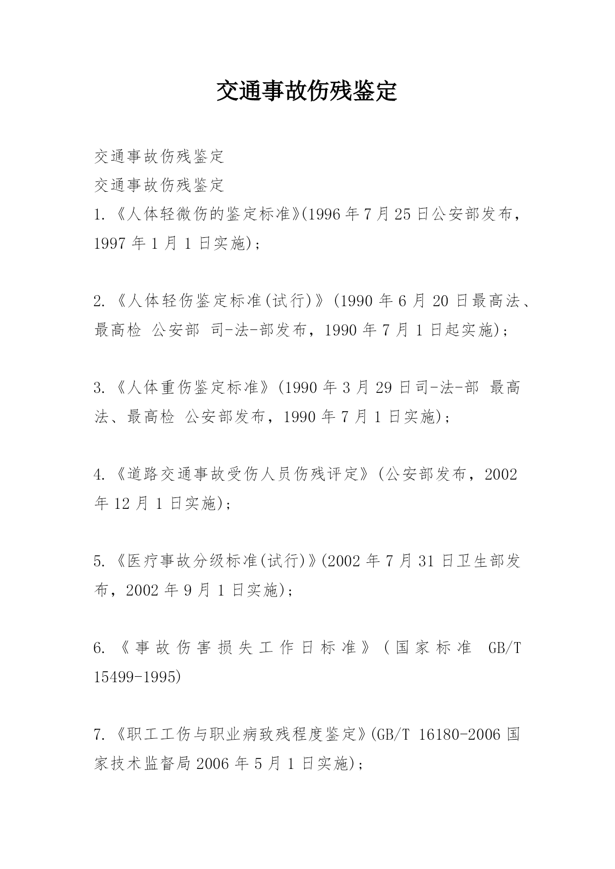 交通事故伤残鉴定交通事故伤残鉴定交通事故伤残鉴定1.《人体轻微伤的鉴定标准》(1996年7月25日公安部发布,1997年1月1日实施);2.《人体轻伤鉴定标准(试行)》(1990年6月20日最高法、最高检公安部司-法-部发布,1990年7月1日起实施);3.《人体重伤鉴定标准》(1990年3月29日司-法-部最高法、最高检公安部发布,1990年7月1日实施);4.《道路交通事故受伤人员伤残评定》(公安部发布,2002年12月1日实施);5.《医疗事故分级标准(试行)》(2002年7月31日卫生部发布,20
