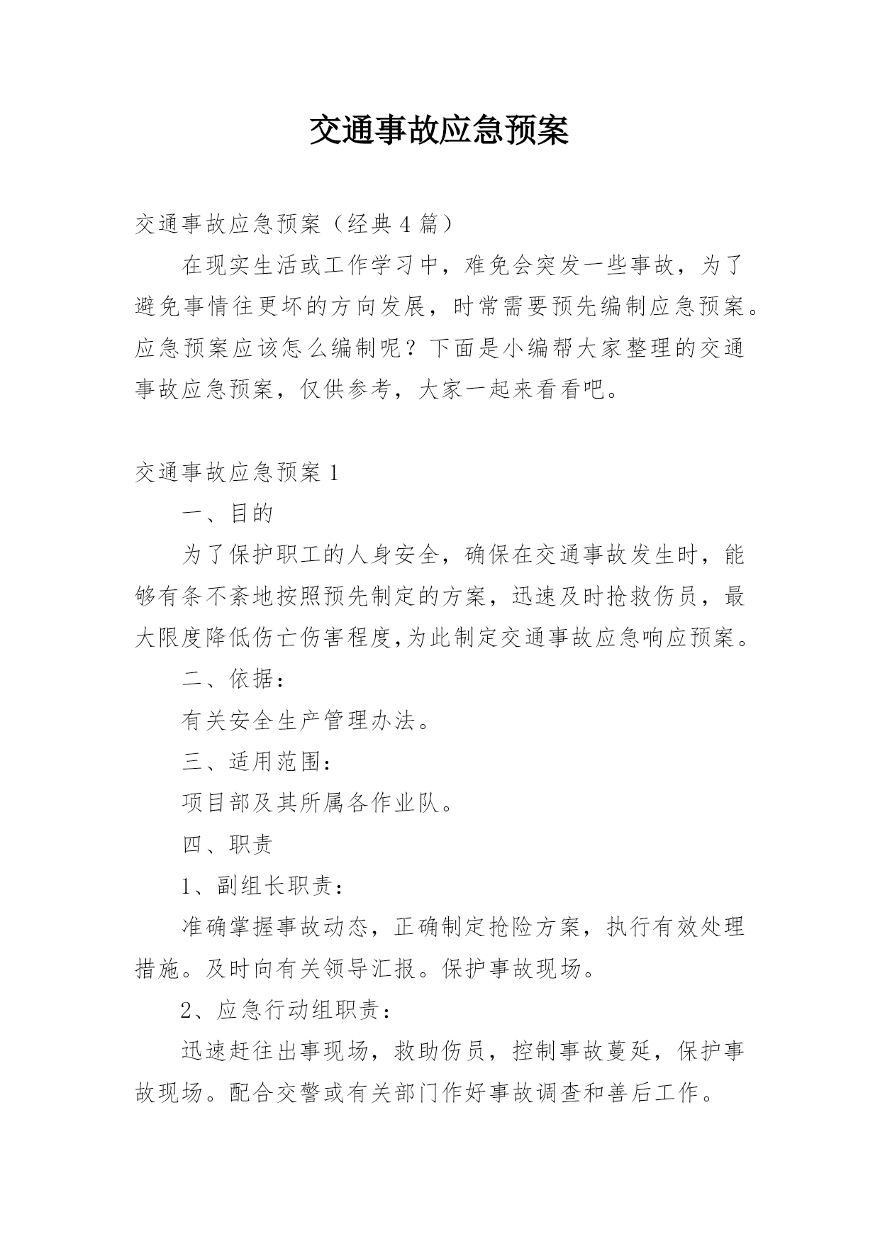 交通事故应急预案交通事故应急预案(经典4篇)在现实生活或工作学习中,难免会突发一些事故,为了避免事情往更坏的方向发展,时常需要预先编制应急预案。应急预案应该怎么编制呢?下面是小编帮大家整理的交通事故应急预案,仅供参考,大家一起来看看吧。交通事故应急预案1一、目的为了保护职工的人身安全,确保在交通事故发生时,能够有条不紊地按照预先制定的方案,迅速及时抢救伤员,最大限度降低伤亡伤害程度,为此制定交通事故应急响应预案。二、依据:有关安全生产管理办法。三、适用范围:项目部及其所属各作业队。四、职责1、副组长职责: