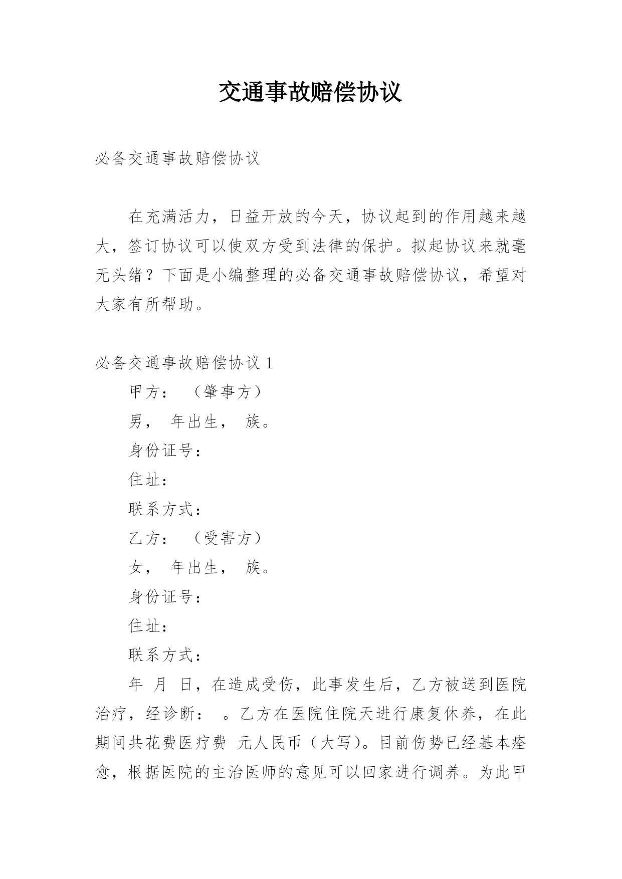 交通事故赔偿协议必备交通事故赔偿协议在充满活力,日益开放的今天,协议起到的作用越来越大,签订协议可以使双方受到法律的保护。拟起协议来就毫无头绪?下面是小编整理的必备交通事故赔偿协议,希望对大家有所帮助。必备交通事故赔偿协议1甲方:(肇事方)男,年出生,族。身份证号:住址:联系方式:乙方:(受害方)女,年出生,族。身份证号:住址:联系方式:年月日,在造成受伤,此事发生后,乙方被送到医院治疗,经诊断:。乙方在医院住院天进行康复休养,在此期间共花费医疗费元人民币(大写)。目前伤势已经基本痊愈,根据医院的主治医师