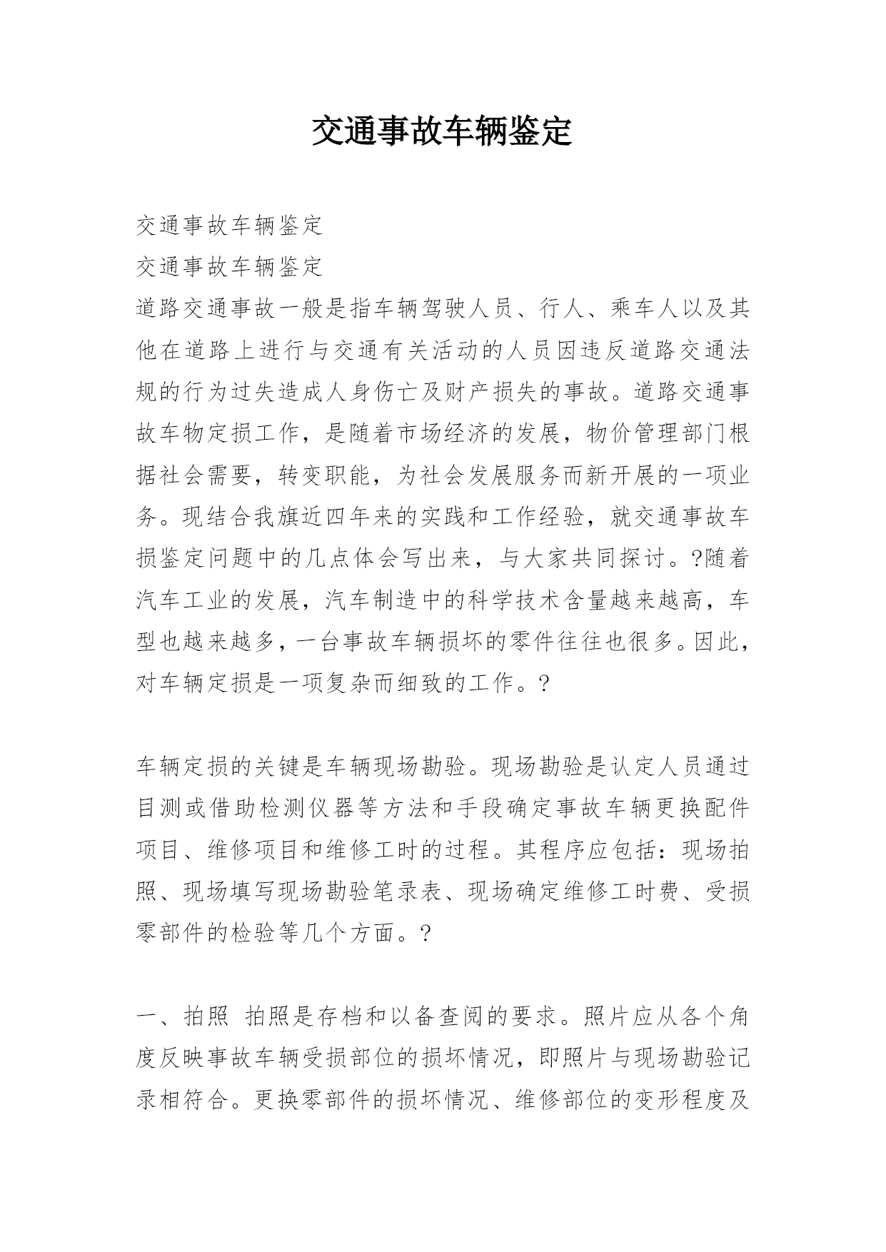交通事故车辆鉴定交通事故车辆鉴定交通事故车辆鉴定道路交通事故一般是指车辆驾驶人员、行人、乘车人以及其他在道路上进行与交通有关活动的人员因违反道路交通法规的行为过失造成人身伤亡及财产损失的事故。道路交通事故车物定损工作,是随着市场经济的发展,物价管理部门根据社会需要,转变职能,为社会发展服务而新开展的一项业务。现结合我旗近四年来的实践和工作经验,就交通事故车损鉴定问题中的几点体会写出来,与大家共同探讨。?随着汽车工业的发展,汽车制造中的科学技术含量越来越高,车型也越来越多,一台事故车辆损坏的零件往往也很多。