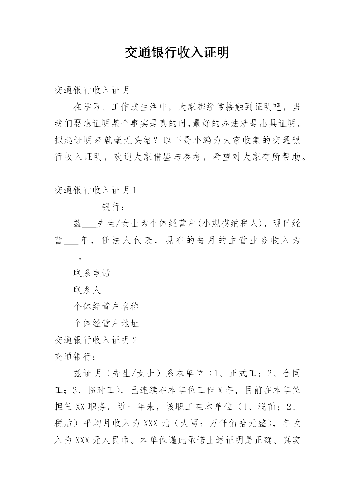 交通银行收入证明交通银行收入证明在学习、工作或生活中,大家都经常接触到证明吧,当我们要想证明某个事实是真的时,最好的办法就是出具证明。拟起证明来就毫无头绪?以下是小编为大家收集的交通银行收入证明,欢迎大家借鉴与参考,希望对大家有所帮助。交通银行收入证明1______银行:兹___先生/女士为个体经营户(小规模纳税人),现已经营___年,任法人代表,现在的每月的主营业务收入为_____。联系电话联系人个体经营户名称个体经营户地址交通银行收入证明2交通银行:兹证明(先生/女士)系本单位(1、正式工;2、合同工