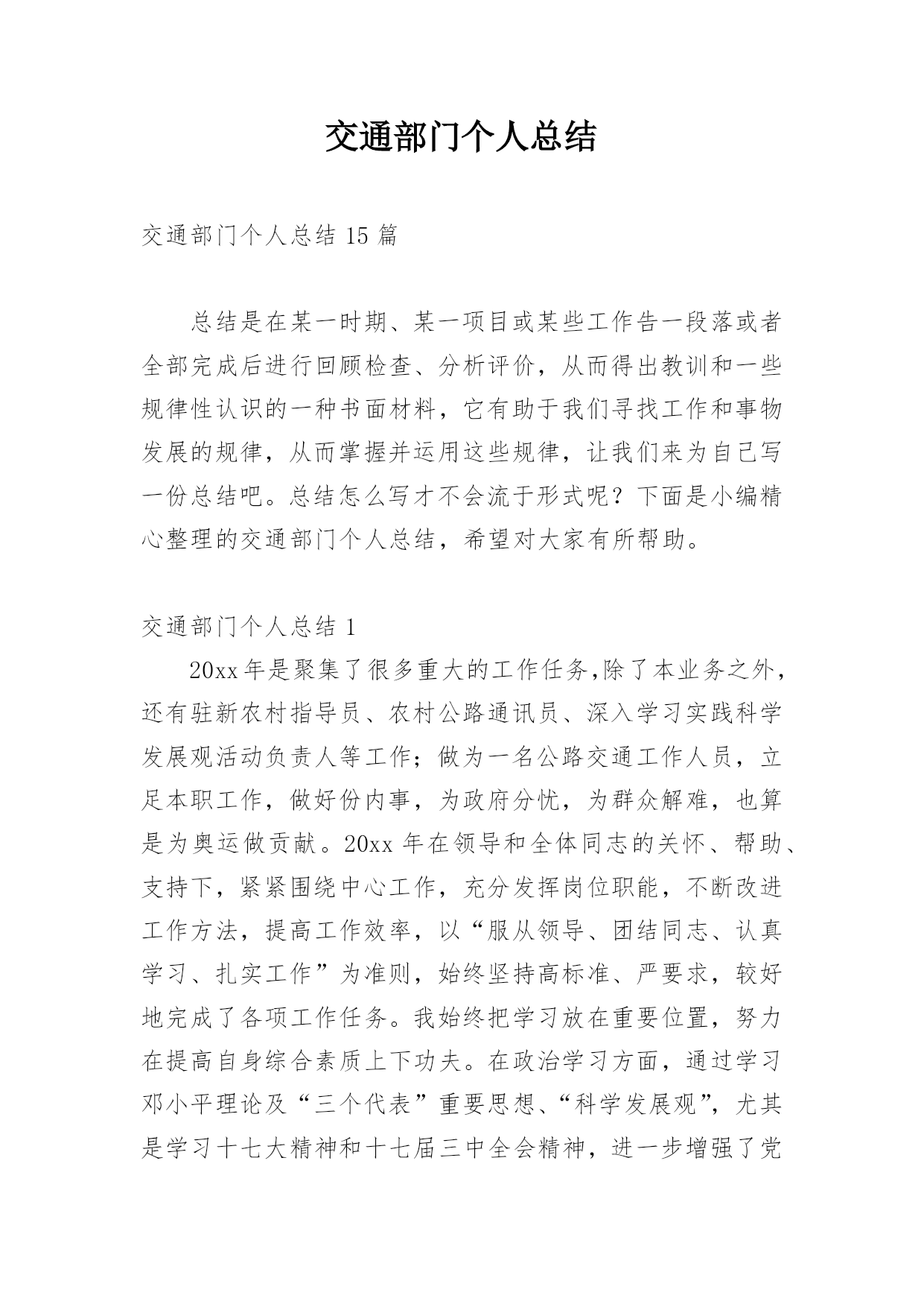 交通部门个人总结交通部门个人总结15篇总结是在某一时期、某一项目或某些工作告一段落或者全部完成后进行回顾检查、分析评价,从而得出教训和一些规律性认识的一种书面材料,它有助于我们寻找工作和事物发展的规律,从而掌握并运用这些规律,让我们来为自己写一份总结吧。总结怎么写才不会流于形式呢?下面是小编精心整理的交通部门个人总结,希望对大家有所帮助。交通部门个人总结120xx年是聚集了很多重大的工作任务,除了本业务之外,还有驻新农村指导员、农村公路通讯员、深入学习实践科学发展观活动负责人等工作;做为一名公路交通工作人